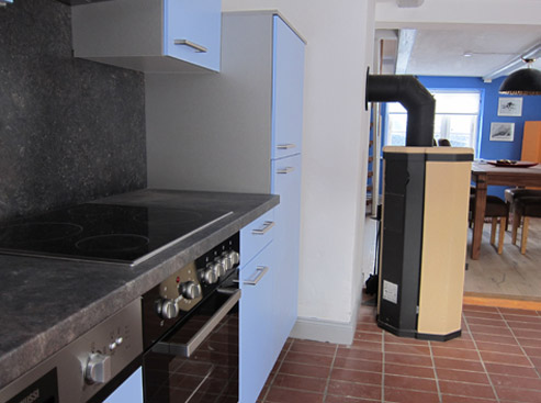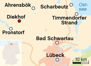liegt in der Holsteinischen Schweiz, ca. 25 km von der Ostseeküste entfernt. Das örtliche Gut ist Spielstätte des Schleswig-Holstein Musik Festivals Nun ging es darum, das Haus neu zu interpretieren, den Charme in eine neue Zeit hinüberzuretten und das aufzuholen, was in den letzten zwei Jahrzehnten liegen geblieben war. Es ist geschafft: Das Haus ist jetzt „wiedervereinigt“. Oben und unten sind Durchbrüche entstanden, wurden tragende Balken unterstützt, Heizungsrohre umverlegt. Zwei extrem steile Treppen wurden beseitigt, die Deckenöffnungen dort geschlossen, an geeigneterer Stelle eine länger gezogene Treppe neu geschaffen, eine Toilettentür dafür über Eck vom Zimmer zum Flur versetzt. Und ziemlich viel Elektrik musste erneuert werden. Das Obergeschoss erhielt Deckenlampen, die Küche einen Starkstromanschluss. Wo es früher nur zwei Herdplatten gab, hat nun eine Einbauküche ihren Platz gefunden, maßgefertigt in Hellblau. Und wo vorher Fischgrätparkett lag, spannen sich nun weit passendere Eichendielen über den Fußboden.