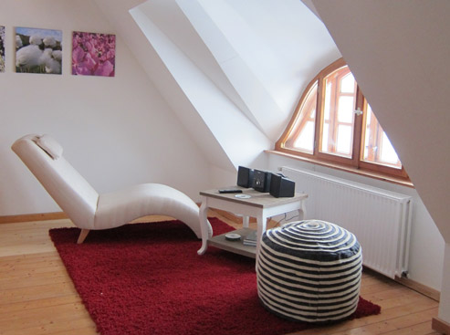 Mein Lieblingsplatz nach all der Arbeit? Schwierige Frage. Entweder im Obergeschoss im Sessel in der Gaube mit Blick über den Bauerngarten und die Felder. Oder unten in dem Zimmer mit den zwei burgunderroten Wänden, den hellgrau lackierten Fachwerkbalken und dem alten Ofen – und dem Blick hinaus in den Obstgarten. Hauptsache irgendwo hier.