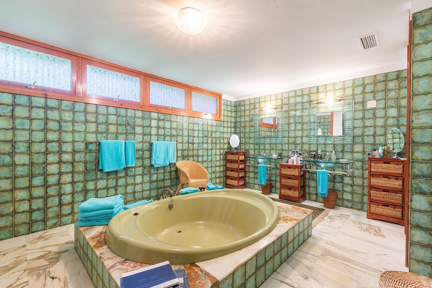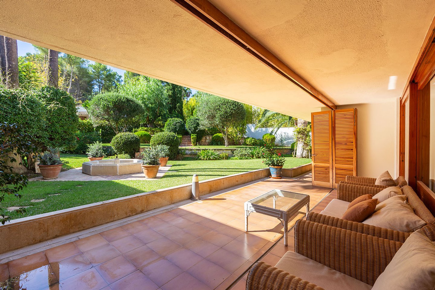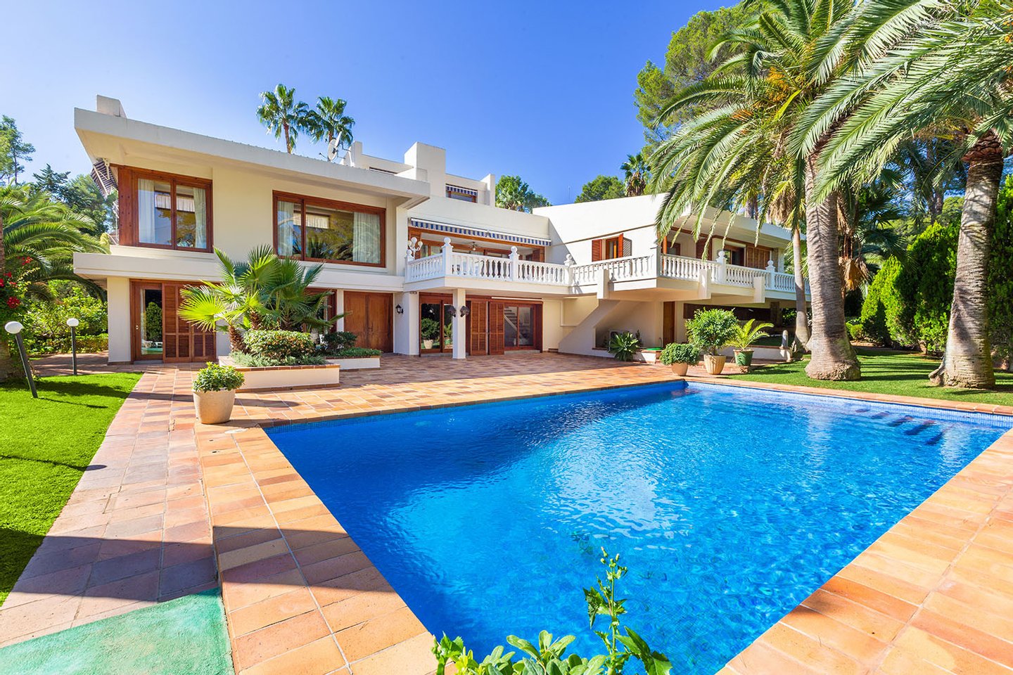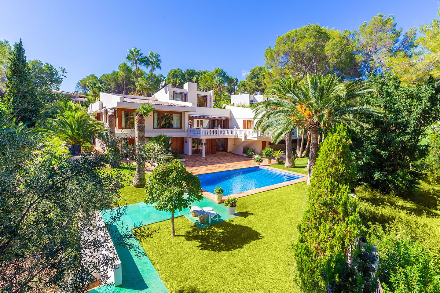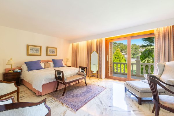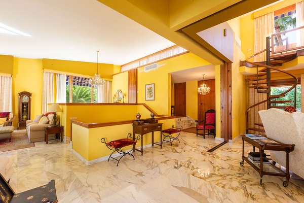 Diese großzügige zweigeschossige Komfortvilla mit Galerie und mehr als 1.000 m² konstruierter Wohnfläche, welche eine Modernisierung bedarf, präsentiert sich auf einem traumhaft angelegten terrassierten Gartengrundstück von 2.500 m² in 1. Linie des Golfplatzes Son Vida und nur wenige Autominuten vom Zentrum, der Hafenpromenade Paseo Marítimo sowie mehreren Stränden und Yachthäfen entfernt. Der Hauptwohnbereich im Erdgeschoss umfasst ein Wohnzimmer mit Galerie, ein Esszimmer, eine Küche, ein geräumiges Hauptschlafzimmer mit eigenem Fitnessbereich, Ankleide und Bad en Suite sowie zwei weitere Schlafzimmer mit einem gemeinsamen Badezimmer. In der darunter liegenden Ebene sind drei weitere Schlafzimmer mit Bädern en Suite und ein Gästeapartment mit Kitchenette und Badezimmer untergebracht. Die exklusive Villa mit viel Privatsphäre befindet sich in der begehrten Villenwohnlage von Son Vida mit den zwei 5-Sterne-Hotels sowie den drei Golfplätzen, ist umgeben von großzügigen freien und überdachten Terrassen mit Barbecue-Bereich sowie Rasenflächen mit eingebettetem Swimmingpool.