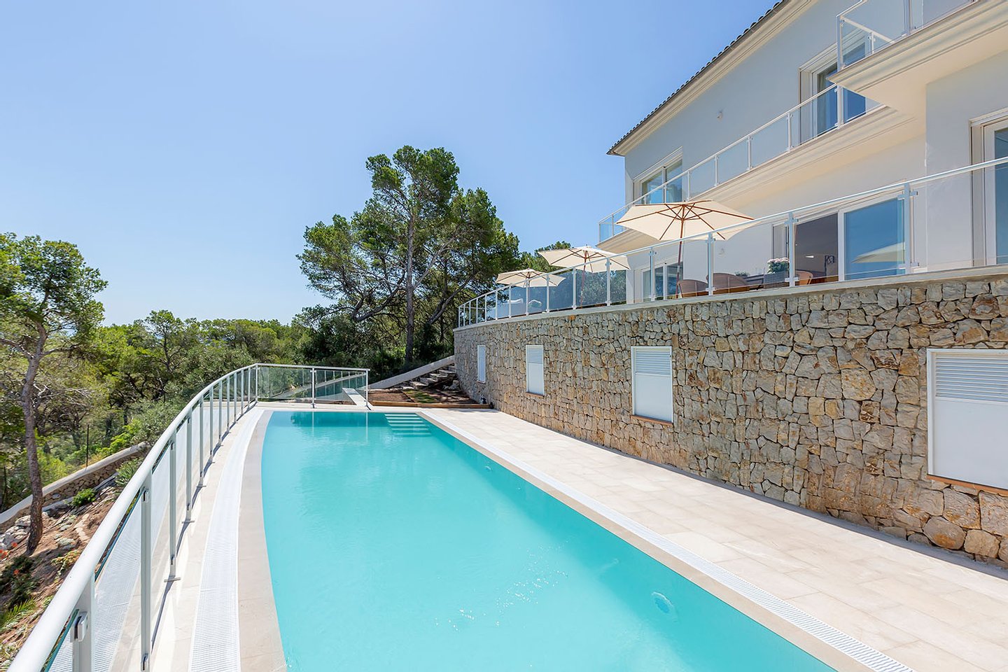Diese renovierte Villa mit direktem Meerzugang und sensationellem Blick auf die Küste und das Meer befindet sich in einer zentralen dennoch sehr ruhigen Wohngegend, auf einer Halbinsel zwischen zwei bekannten Ferienorten, ca. 15 km von Palma und dem Flughafen entfernt. Die Lage bietet absolute Privatsphäre und verfügt über eine hervorragende Infrastruktur an der Südwestküste der Insel mit ihrem malerischen Hinterland. Auf der Eingangsebene im Erdgeschoss verfügt das hochwertig ausgestattete Haus über einen großzügigen Wohn-/Essbereich mit offener Küche und Kamin-Lounge, ein Schlafzimmer mit Bad, einen Wirtschaftsraum und eine Gästetoilette. Auf gleicher Ebene befindet sich eine Garage mit direktem Hauszugang. In der oberen Etage befinden sich das Hauptschlafzimmer mit Bad und Ankleide, zwei weitere Schlafzimmer, zwei Bäder (eines davon en suite) sowie ein Abstellraum und eine große Sonnenterrasse. Zusätzlichen Platz für Gäste bietet ein separates, geräumiges Apartment mit großzügigem Wohn-/Schlafzimmer, einer Küche, einem Duschbad sowie Technikraum im Untergeschoss. Der einladende Außenbereich ist gärtnerisch angelegt und bietet gemütliche Terrassen mit integriertem Swimmingpool und fantastischem Ausblick.