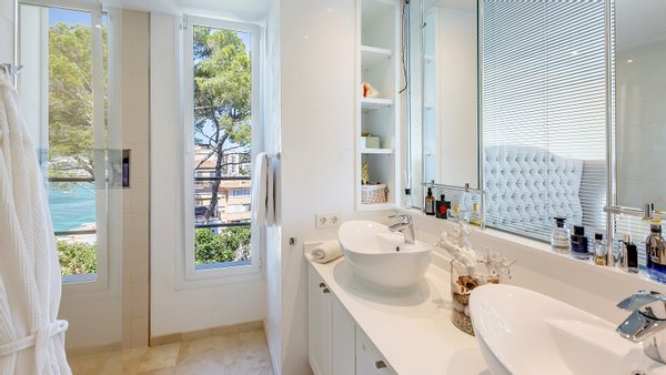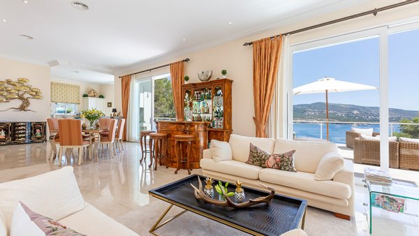 Diese sensationelle Villa auf einem wunderschönen, großzügigen Grundstück in 1. Meereslinie bietet Ihnen einen direkten Meerzugang ins kristallklare Wasser. Die Immobilie wurde im Jahr 2020 umfangreich renoviert und modernisiert und präsentiert sich mit weitläufigen Terrassenbereichen zum Sonnen. Die Villa verfügt insgesamt über 5 Schlafzimmer, 5 Badezimmer, vier davon en Suite, einen großen Salon mit verschiedenen Sitz- und Essbereichen, eine Einbauküche mit Elektrogeräten von Miele, sowie einen Fitness- und Saunabereich. Des Weiteren bietet die Villa ein separates Gästeapartment mit einem Schlafzimmer, einem Badezimmer und einer kleinen Einbauküche. Zu den Ausstattungsmerkmalen der Villa gehören: Fußbodenheizung über Wärmepumpe, Kamin, Klimaanlage w/k, doppelverglaste Aluminiumfenster, Trinkwasserfilteranlage, Alarm- und Gegensprechanlage, Porzellanfliesen, Telefonanschluss, SAT TV. Eine Doppelgarage mit elektrischem Tor befindet sich ebenfalls auf dem Grundstück. Erleben Sie auf den weitläufigen Terrassen die einmalige Nähe zum türkisfarbenen Meer und genießen Sie das mediterrane Flair! Villen in erster Meereslinie sind eine Rarität und somit eine sehr gute Investition in Ihre Zukunft.