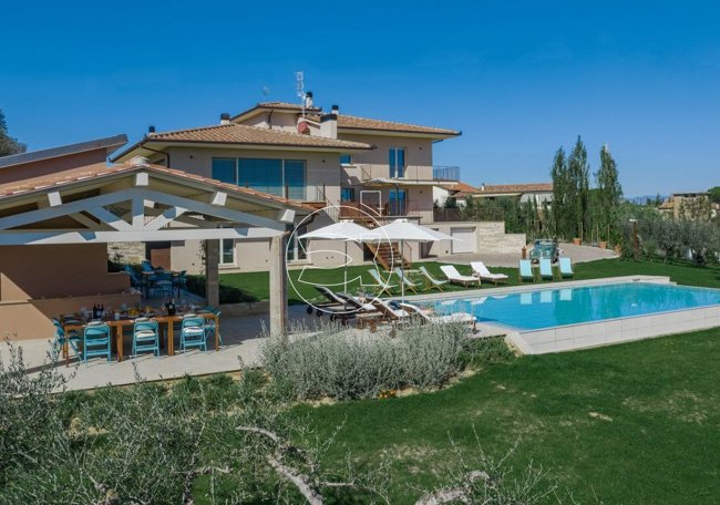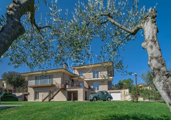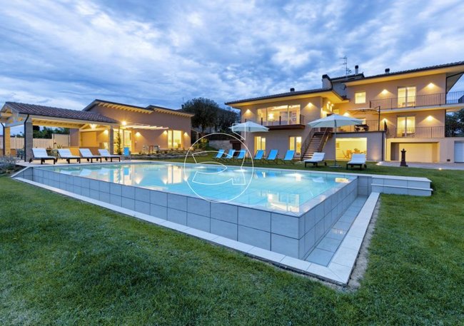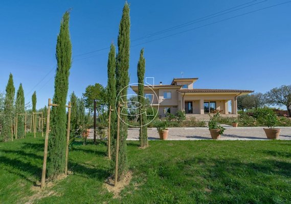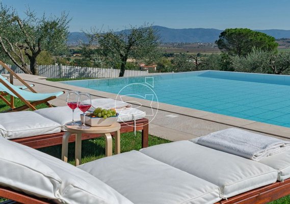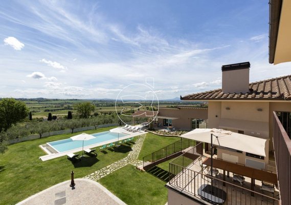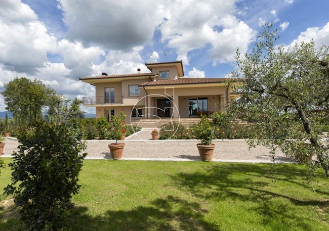 In der toskanischen Landschaft, in der Provinz Arezzo, befindet ich diese moderne Luxus-Villa mit Nebengebäude und großem Grundstück mit Olivenhainen.