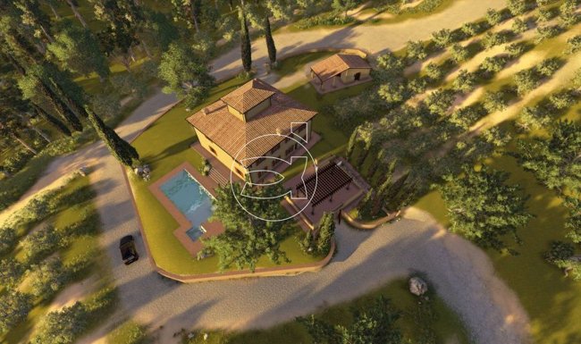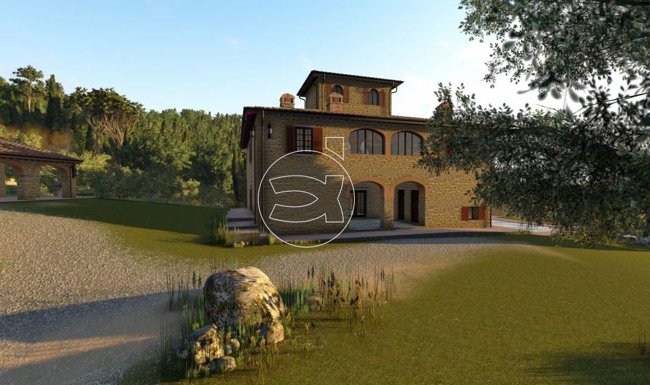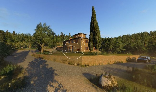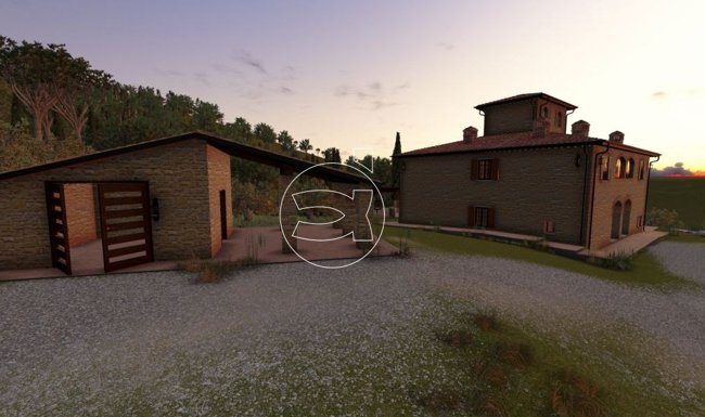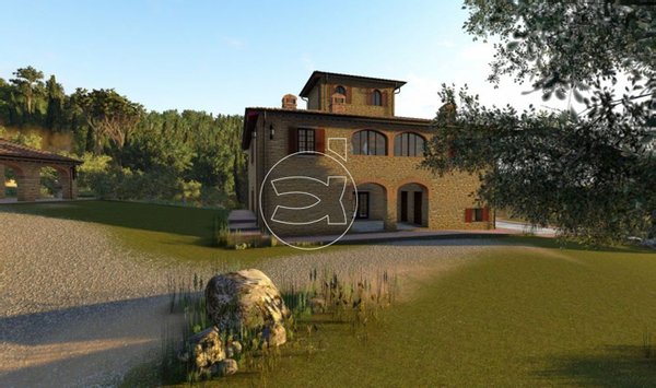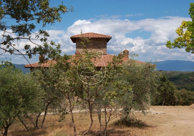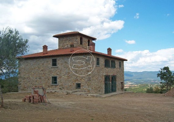 Das Anwesen genießt eine wunderschöne Hanglage mit Panoramablick über die toskanischen Hügel. Das Haus, auf zwei Ebenen plus Turm für insgesamt 460 Quadratmeter ausgebaut, ist derzeit im Rohzustand. Im Erdgeschoss gibt es eine Veranda, großes Wohnzimmer, Esszimmer, Wohnzimmer, Küche, Speisekammer, Hauswirtschaftsraum und Bad.