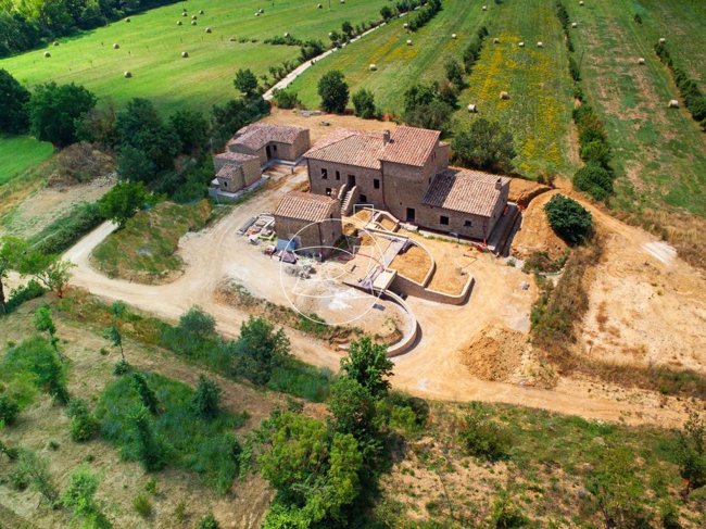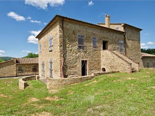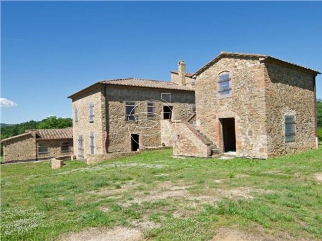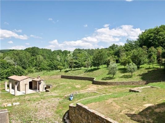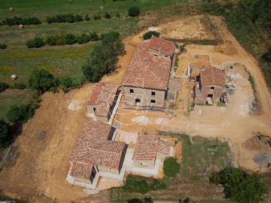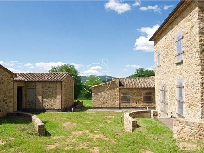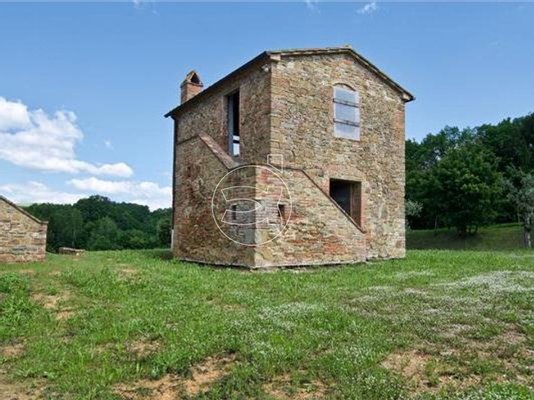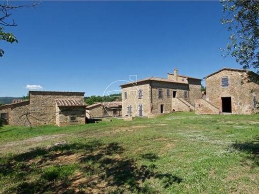 Der kleine Steinweiler, der sich derzeit im Rohzustand befindet, umfasst eine Gesamtfläche von ca. 740 qm und besteht aus einem Haupthaus und weiteren kleineren Nebengebäuden, die auf einem flachen Grundstück mit herrlichem Blick über die toskanische Landschaft liegen.