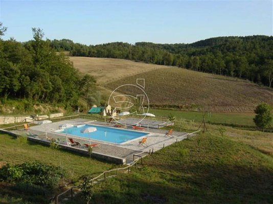 Die in Wohnungen und Zimmer unterteilten Häuser und das Schwimmbad befinden sich in Panoramalage mit Blick auf den See und das Tal, wo Ruhe und Frieden herrschen und das Auge auf der typischen Landschaft dieser Gegend ruhen kann, die sich durch eine endlose Abfolge von harmonischen Hügeln auszeichnet, die mit Wäldern, Weinbergen, Olivenhainen und kultivierten Feldern mit Sonnenblumen und Getreide bedeckt sind.