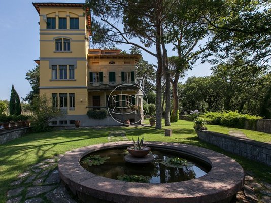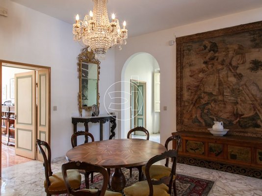 Es gibt große Empfangsräume wie das Billardzimmer, das Arbeitszimmer mit der alten Bibliothek und das Esszimmer. Die sehr schöne Villa ist umgeben von einem Blumengarten, einem großen Pinienwald und einem hügeligen Gelände mit alten Olivenbäumen.
