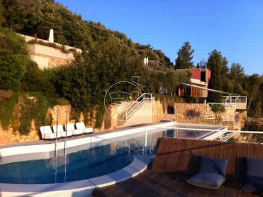 Das neu gebaute Anwesen befindet sich in einem schönen terrassierten Garten mit Infinity-Pool mit 18x4 Meter sowie einem Solarium. Die Villa bietet einen Panoramablick aus den meisten Zimmern und vor allem aus den Wohnzimmern, welche über große Fenster verfügen.