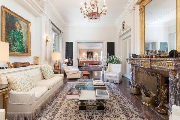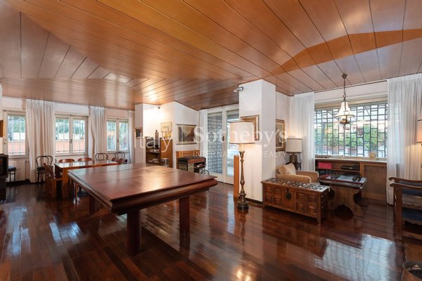 Auf der Via Barnaba Oriani, einer der prestigeträchtigsten Straßen des Wohnviertels Parioli, erstreckt sich diese exklusive Luxusvilla über 4 oberirdische Ebenen zusätzlich zum Untergeschoss und ist von einem herrlichen, hauptsächlich gepflasterten Garten