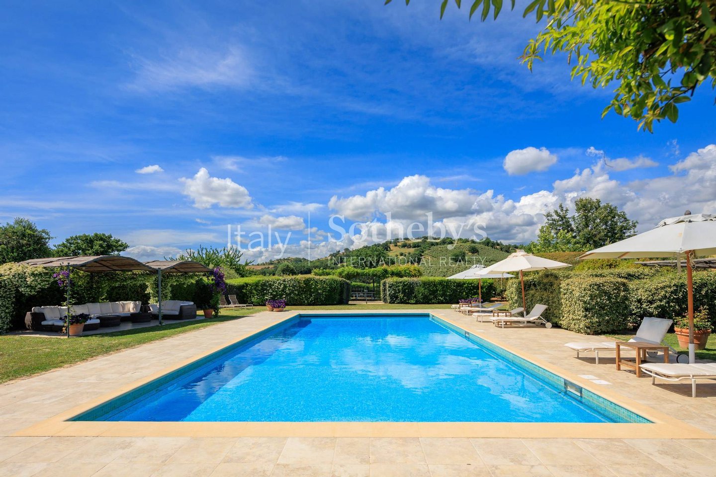 Spektakuläres Anwesen in den Hügeln mit Weinbergen und Olivenhainen, nur 8 km vom Thermal- und Golfresort Saturnia und nur 50 Minuten vom Meer des Argentario entfernt. Es besteht aus 40 Hektar Land (17 Hektar ausschließlich Olivenhaine in voller