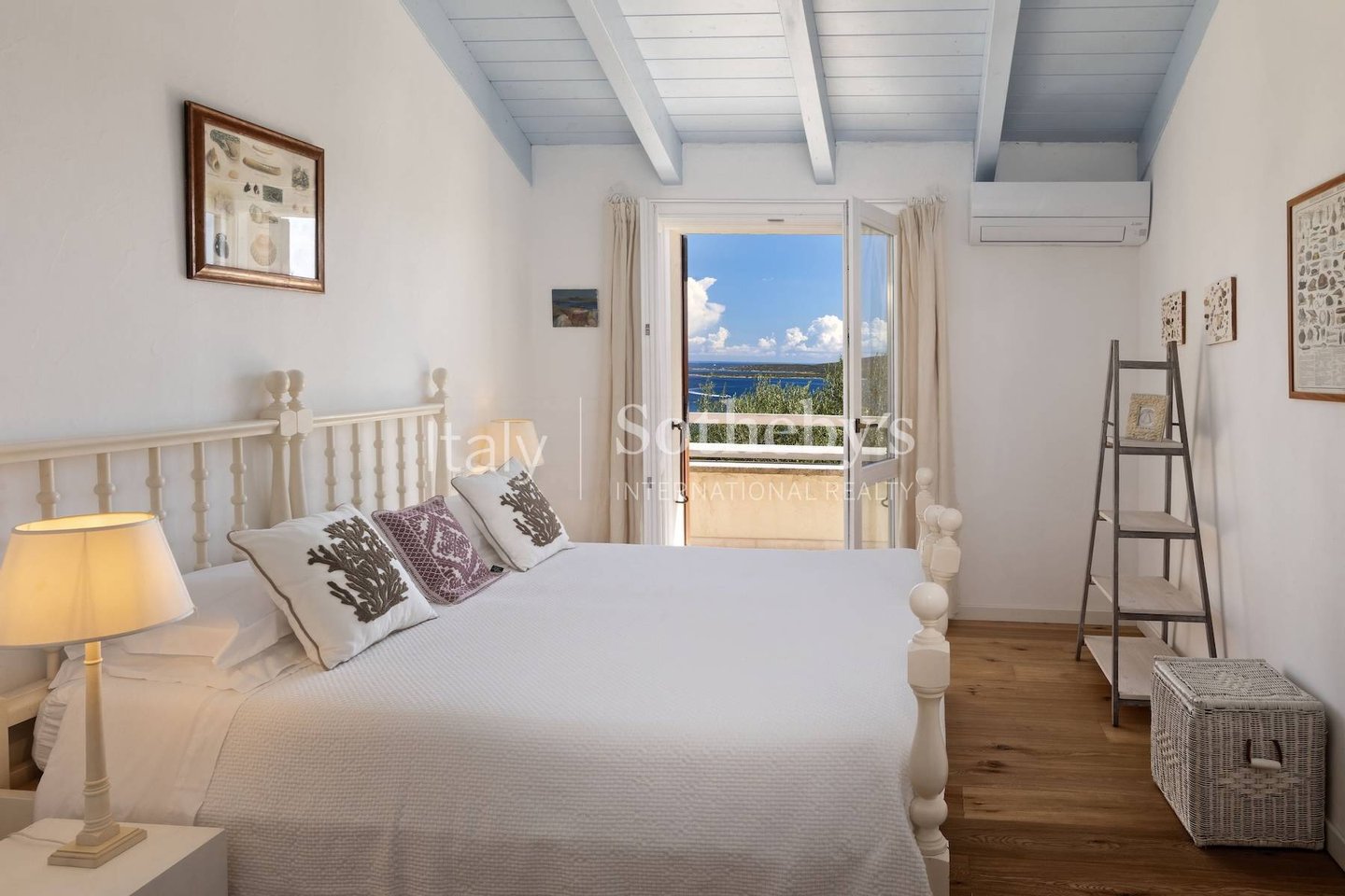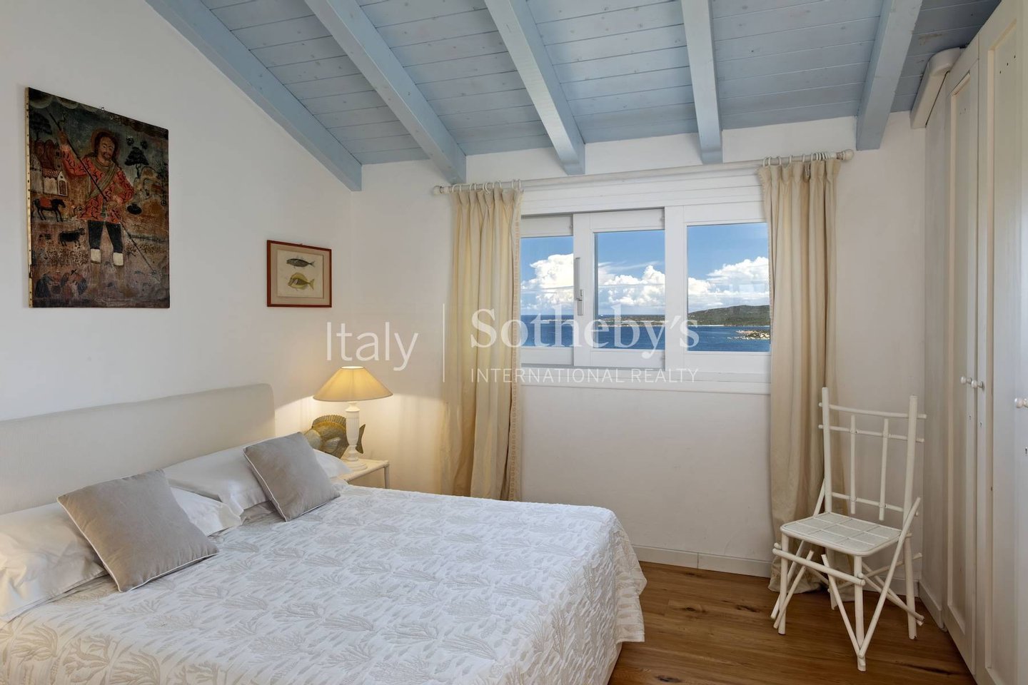 Im Erdgeschoss gibt es den großzügigen Wohnbereich, der zu einer Veranda mit wunderschönem Panoramablick auf den Garten und das von Natur umrahmte Meer führt. Die Wohnküche und das Wohn-Esszimmer öffnen sich beide direkt zu den Außenräumen. Im Erdgeschoss gibt es auch das Schlafzimmer mit Doppelbett und ein zweites Schlafzimmer, jedes mit eigenem Bad.