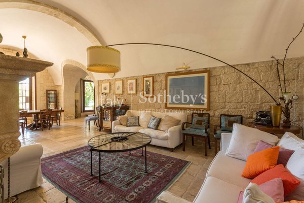 Das Haupthaus erstreckt sich über zwei Ebenen und ist über mehrere Eingänge zugänglich. Der größte Teil des Erdgeschosses ist einem großen offenen Wohn- und Esszimmer gewidmet, das elegant mit drei verschiedenen Bereichen eingerichtet ist: einer mit Kamin, Sofas und Sesseln, der zweite beherbergt den Esstisch, während der dritte eine weitere Sitzecke mit Fernseher beherbergt. . Eine Reihe von Glastüren öffnen sich zu den Gärten.