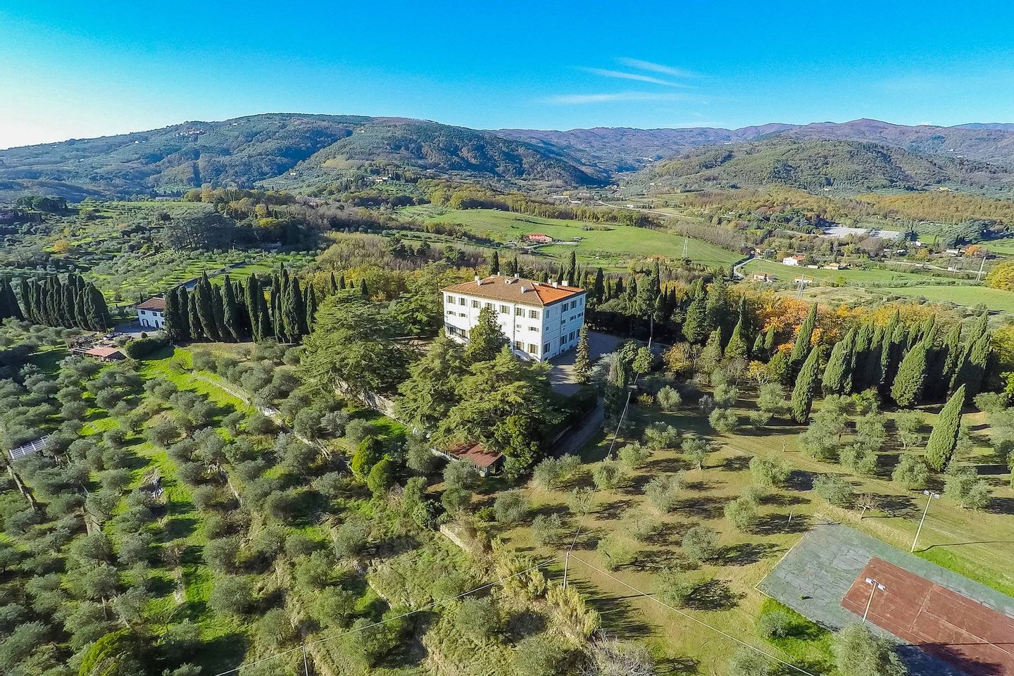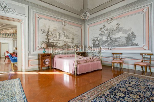 Villa il Merlo ist ein historischer Bau, der um 1750 fertiggestellt wurde und elegant auf den Hügeln von Pistoia liegt, umgeben von Hektar Wald, Zypressen- und Olivenhainen. Der Name leitet sich von der Ortschaft Merlo ab, die dank der ständigen Präsenz des Turdus merula benannt wurde. Die klare Fassade, der steinerne Giebel und die Rahmung der Saitengänge in ihrer Schlichtheit, harmonisch und fast streng. Die Villa mit ihren Panoramagärten dominiert ein wunderschönes Panorama, das an klaren Tagen die Kuppel des Doms von Florenz und die gesamte Ebene, die sich im Westen mit den Türmen von Serravalle schließt, sehen kann. Im Inneren ist die Villa mit raffinierten mythologischen Szenen und Landschaften vollständig mit Fresken verziert, die von architektonischen Dekorationen durchsetzt sind, die immer mit Fresken versehen sind und die Strukturen hervorheben. Die Villa hat drei Stockwerke, zwei edle Stockwerke und ein Zwischengeschoss sowie einen Keller, in dem die Küchen und Keller untergebracht sind. Die vier Etagen sind durch eine große Treppe und einen Aufzug verbunden. Dieses Gebäude ist von innen praktisch intakt, nachdem es einige Besitzerwechsel und kein Ziel durchgemacht hat. Erbaut von Giuseppeppoliti, ging die Villa durch Erbschaft an die Familie Settimanni und dann die Familie erst im letzten Jahrhundert an die Familie Bini und Mitte der 1960er Jahre an den jetzigen Besitzer, der in diesen Jahren eine vollständige Restaurierung durchführte Dekorationen und dann mit raffinierten Stilmöbeln ausstatten. Eine kleine Kapelle, intim und nicht prunkvoll, erinnert an die Gelübde von Giuseppe Ippoliti, dem Bauherrn der Villa, der zum Bischof von Cortona und später von Prato und Pistoia ernannt wurde. Die Villa hat eine Innenfläche von ca. 1500 qm. Für ein Set von 25 Zimmern plus Dienstleistungen und Korridore. Neben der Villa, 100 Meter entfernt, befindet sich ein großes restauriertes Bauernhaus, das seit jeher das Hauptgebäude unterstützt.