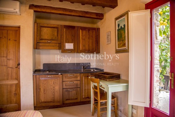Eine elegante Außentreppe führt in die Eingangshalle. Der Wohnbereich zeichnet sich durch große Öffnungen aus, die für klassische toskanische Landhäuser ungewöhnlich sind. Er verfügt über ein Esszimmer und eine große Wohnküche neben der schönen überdachten Terrasse für Mahlzeiten im Freien. Ein Service-Badezimmer und eine Speisekammer vervollständigen diese Etage.