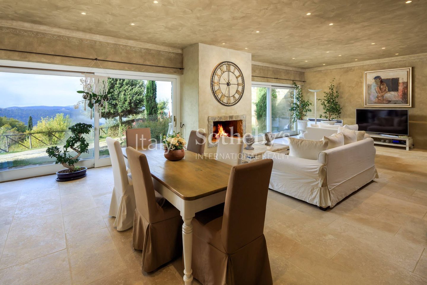 Es ist umgeben von ca. 8000 qm Land mit 30 Olivenbäumen. Die Zufahrt führt zum Parkplatz neben dem Garten, wo ein herrlicher Seerosensee den perfekten Rahmen bietet, um die spektakuläre Aussicht zu genießen, vielleicht um ein Buch zu lesen oder einfach nur frische Luft zu atmen. Ausgehend vom Keller hat das Anwesen selbst in den für Garagen und Schuppen bestimmten Räumen, in denen sich heute ein großer Raum mit Kamin, Arbeitszimmer und Badezimmer befindet, ein edles Finish. Wenn Sie eine Treppe mit einer Gewölbedecke aus Backstein steigen, gelangen Sie in die S1-Etage, von der aus Sie durch große französische Fenster auf die fantastische Terrasse mit Blick auf den Pool und das Panorama gelangen. Ein unbezahlbarer Ort, um die wunderschöne Landschaft der sienesischen Landschaft zu genießen gutes Glas Rotwein. Hier finden wir zwei Wohnbereiche, einen mit Kamin und einen mit Fernseher, sowie ein Esszimmer und eine Küche mit Hauswirtschaftsraum, in denen der Einfachheit halber ein Badezimmer eingerichtet wurde. Wenn Sie weiter klettern, erreichen Sie das Erdgeschoss, in dem sich der Schlafbereich mit drei komfortablen Schlafzimmern befindet, eines davon mit eigenem Bad und Kamin. Von dieser Etage aus betreten Sie den Garten auf der gleichen Höhe wie das Nebengebäude von etwa 10 qm, ideal für ein Arbeitszimmer. Einer der interessantesten Aspekte dieser Immobilie ist die Bequemlichkeit, an das städtische Aquädukt angeschlossen zu sein und einen Brunnen für die Bewässerung zu haben. Die Fußbodenheizung besteht ausschließlich aus Flüssiggas und die Zimmer sind klimatisiert.