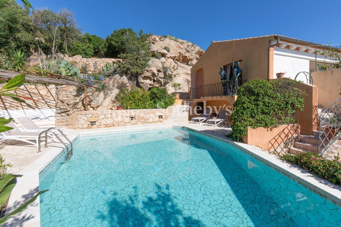 Ein paar Schritte von der Terrasse entfernt befindet sich der Pool, der durch das Mosaik aus Orosei-Marmor hergestellt und verziert wurde. Er verfügt über einen Sonnenbereich, der perfekt von einer gepflegten Vegetation eingerahmt ist und dank dessen hervorragende Privatsphäre herrscht.