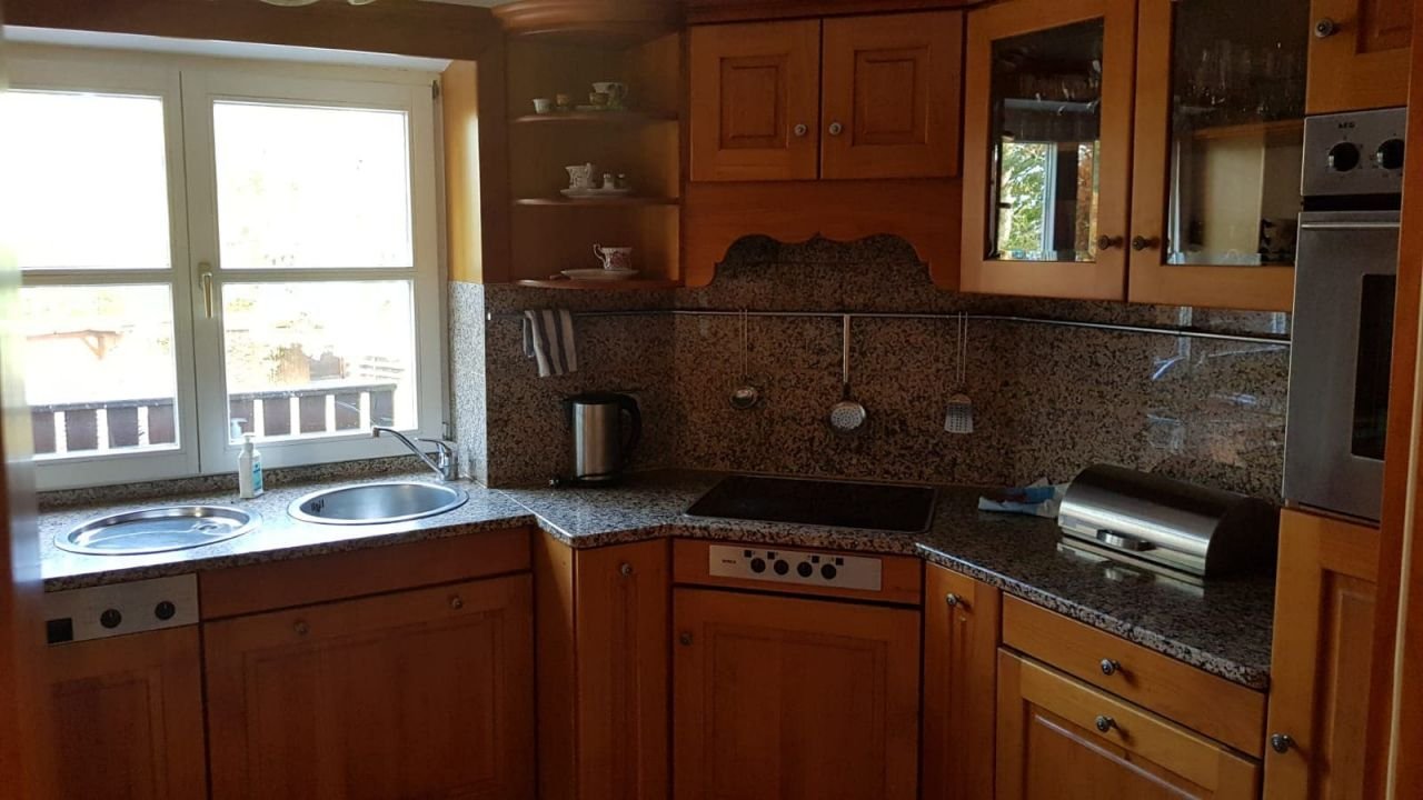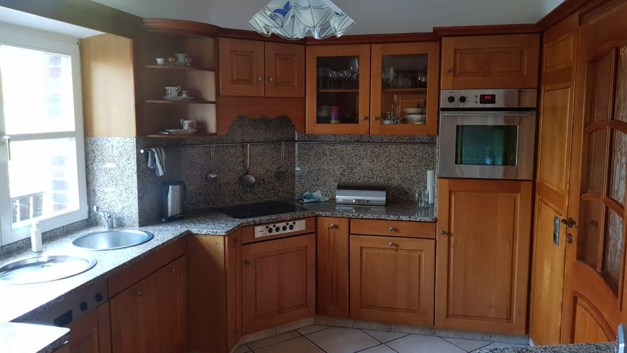 Die schicke Küche, mit Marmorplatten und ebenso gekonnt verarbeitetem Kirschholz, wird jede Hausfrau zu Luftsprüngen veranlassen....