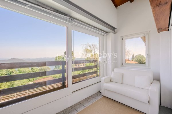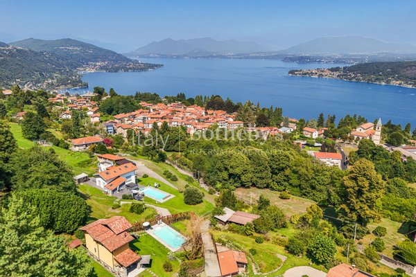 Die Villa ist von viel Grün umgeben und verfügt über einen Infinity-Pool mit Blick auf den Lago Maggiore. Sie erstreckt sich über zwei Ebenen und verfügt über große Fenster, die die Räume mit natürlichem Licht durchfluten und einen spektakulären Blick auf den See bieten.