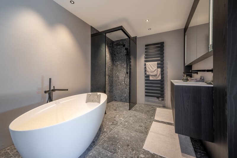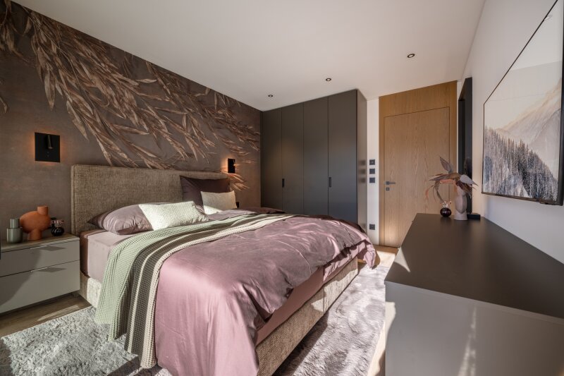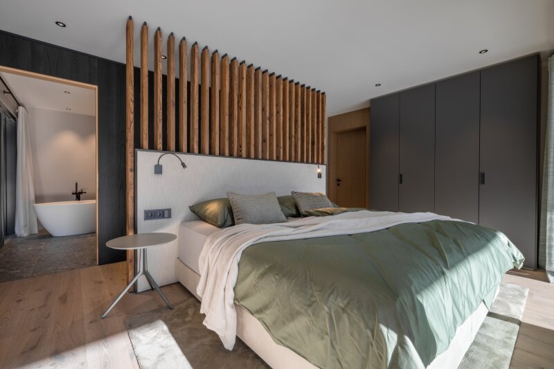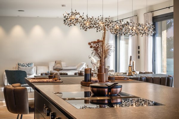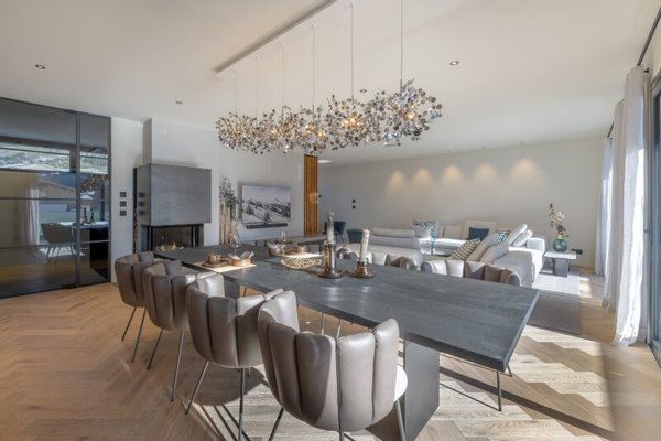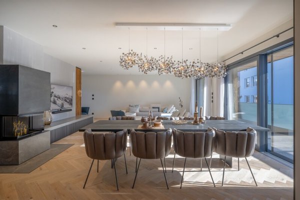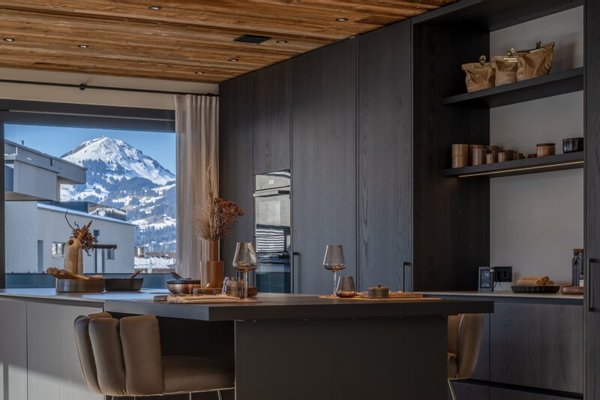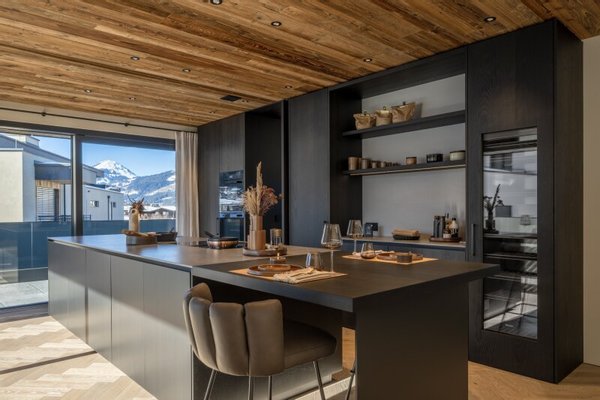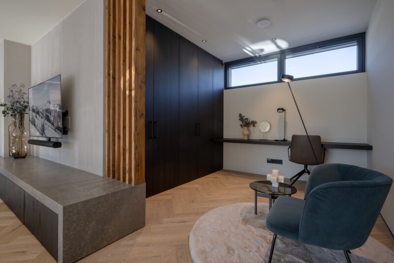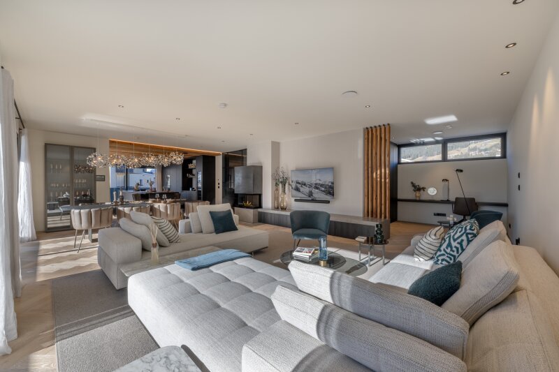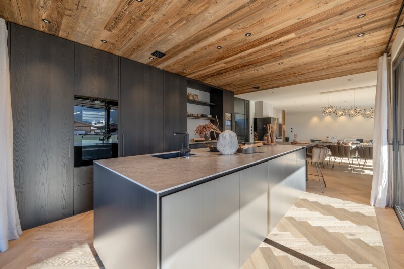 Der Hauslift führt in das erste Obergeschoß mit Masterbedroom samt Ankleide und Badezimmer sowie drei weiteren Schlafzimmern und Bad, dieser Bereich wird von einer lauschigen Terrasse flankiert. Das zweite Obergeschoß, welches als offen gestalteter Wohn-Essbereich ausgeführt ist, umfasst eine Profi-Küche, die alle erdenklichen Extras beherbergt wie ein Bora Kochfeld, Dampfgarer und Wärmelade, Weinklimaschrank, Bartheke mit Barhockern und eine Back-Kitchen inklusive Hauswirtschaftsraum. Der großzügige Esstisch bietet Platz für bis zu 10 Personen, der Kaminofen mit Sichtfenster trennt den Raum zur gemütlichen Sitzlandschaft und einem Home-Office Bereich.