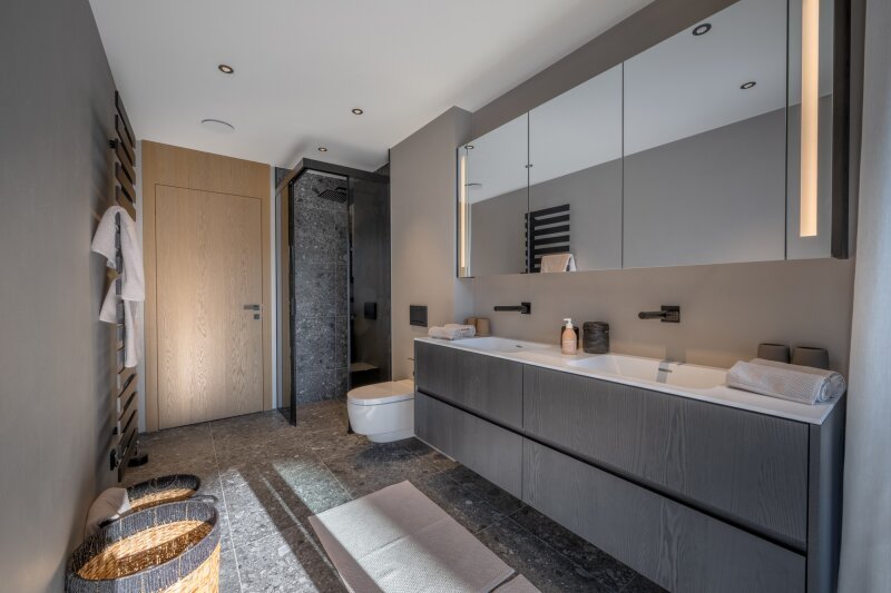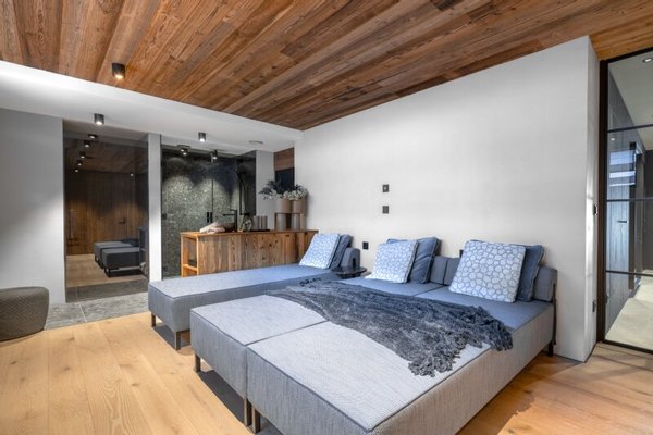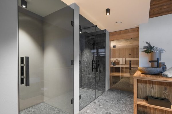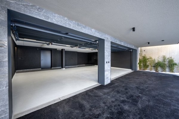 Über eine private Zufahrt gelangt man zum Vorplatz mit mehreren PKW-Stellplätzen sowie zur Garage mit 3 Stellplätzen. In diesem Geschoß befinden sich auch der Eingangsbereich mit großzügiger Tagesgarderobe, getrennter Sportgarderobe mit Skiraum und Skischuhtrocknern sowie ein elitärer Wellnessbereich mit Sauna, Dusche, Relax-Zone samt Daybed.