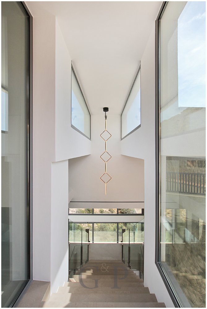 Aus fast jedem, der lichtdurchfluteten und großzügig geschnittenen Räume und Schlafzimmer, genießen Sie den Blick auf das Meer. Auf dem dreigeschossigen Haus wurde ein einladender Lounge -Bereich geschaffen. Von hier gelangt man bereits mit dem Fahrstuhl in jede der drei Etagen.