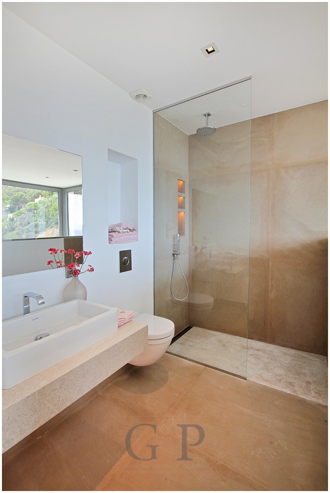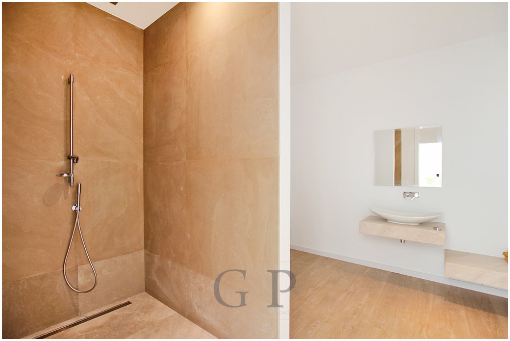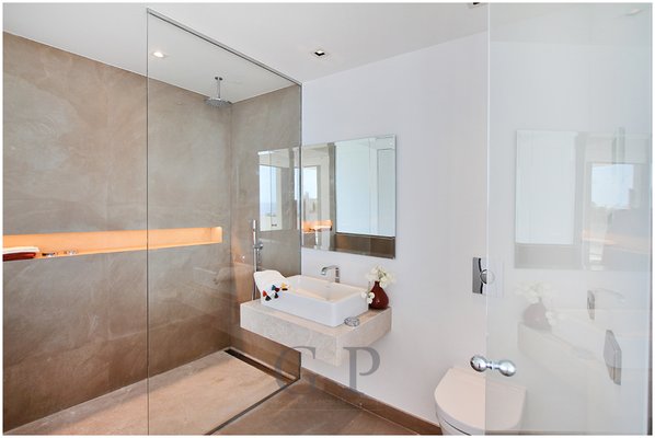 Der sich darunter befindliche Schlafbereich betreten Sie durch eine Eingangshalle mit Fensterfront Richtung Meer. Diese Etage ist aufgeteilt in drei Schlafzimmer, jedes mit Bad en- suite. Darunter befindet sich der Masterbedroom, der über einen Lounge Bereich und ein Badezimmer mit Doppelwaschbecken und zwei Duschen verfügt. Des Weiteren gelangen Sie von hier auf eine Terrasse.
