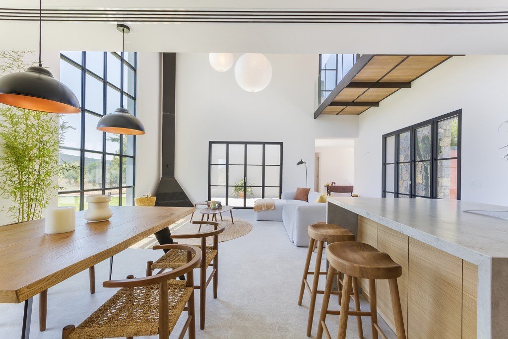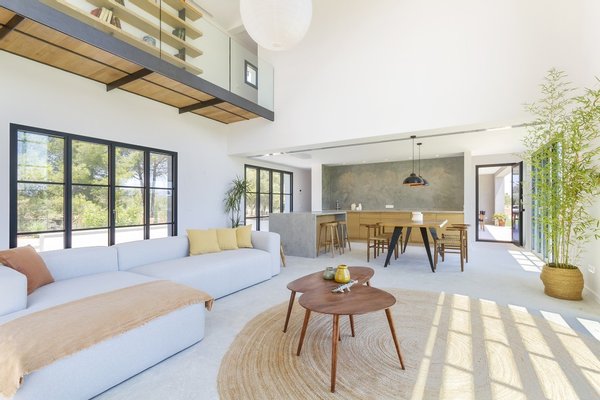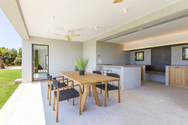 Die andere Seite der Villa verfügt über eine Einbauküche mit Frühstücksbar, einen Essbereich und einen Wohnbereich mit doppelter Deckenhöhe und einer offenen Galerie. Von hier aus gelangt man direkt auf die überdachte Terrasse, die mit einer Außenküche mit Grill und einem Essbereich im Freien ausgestattet ist, perfekt für Gäste.