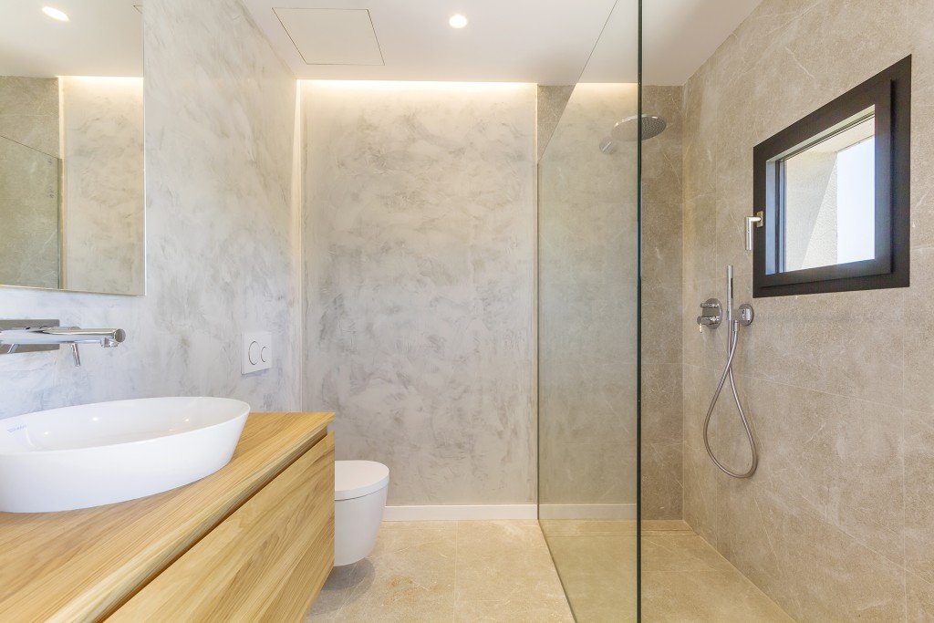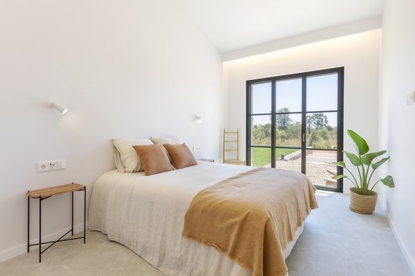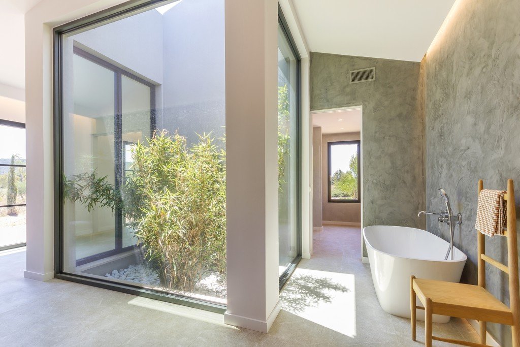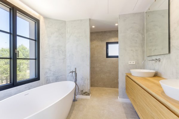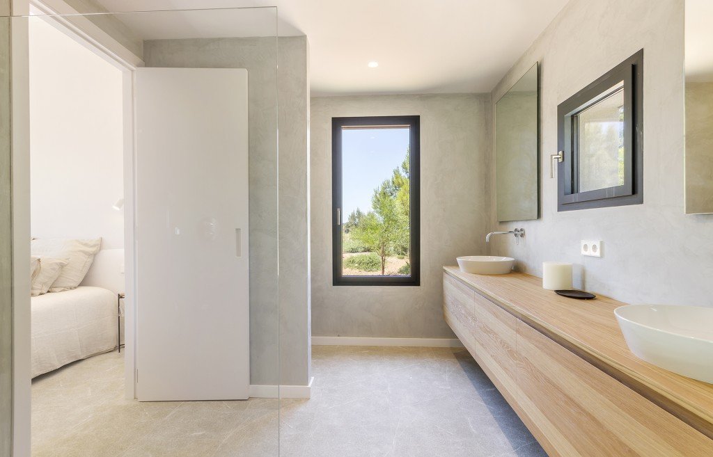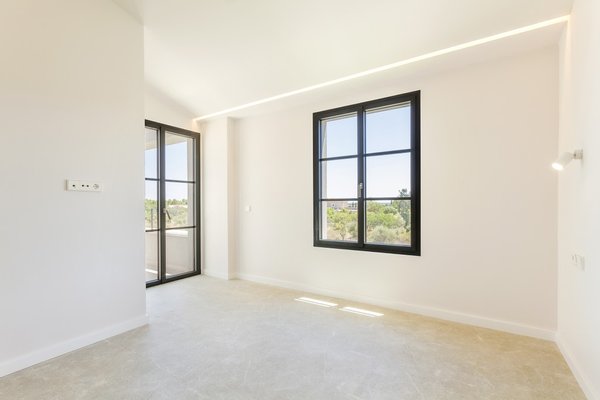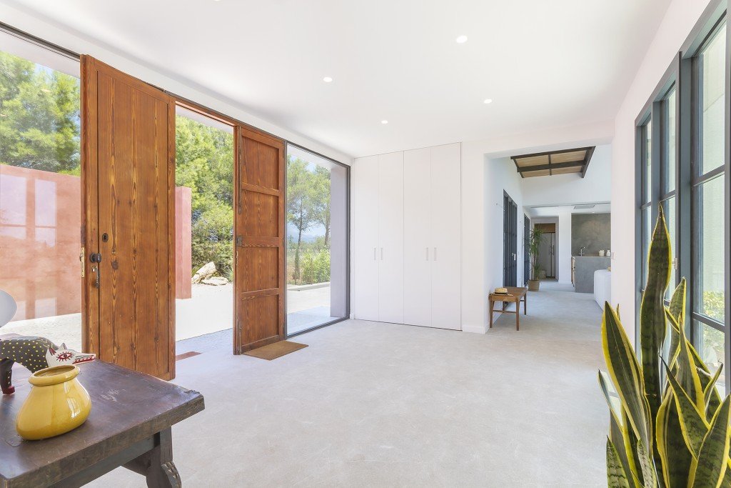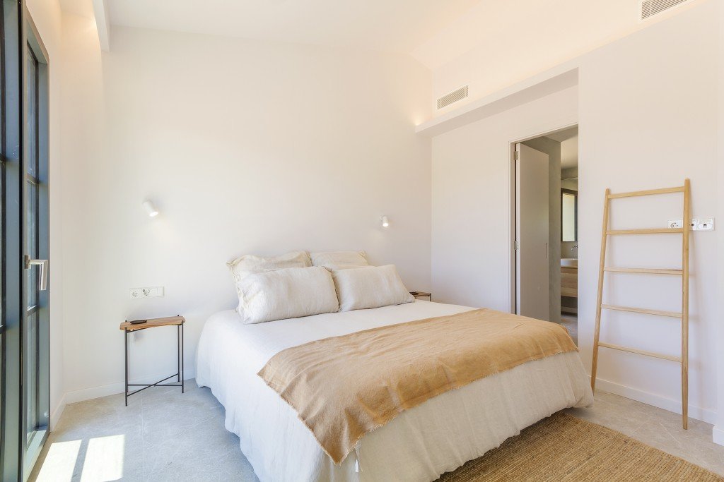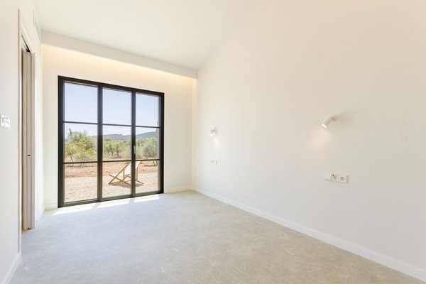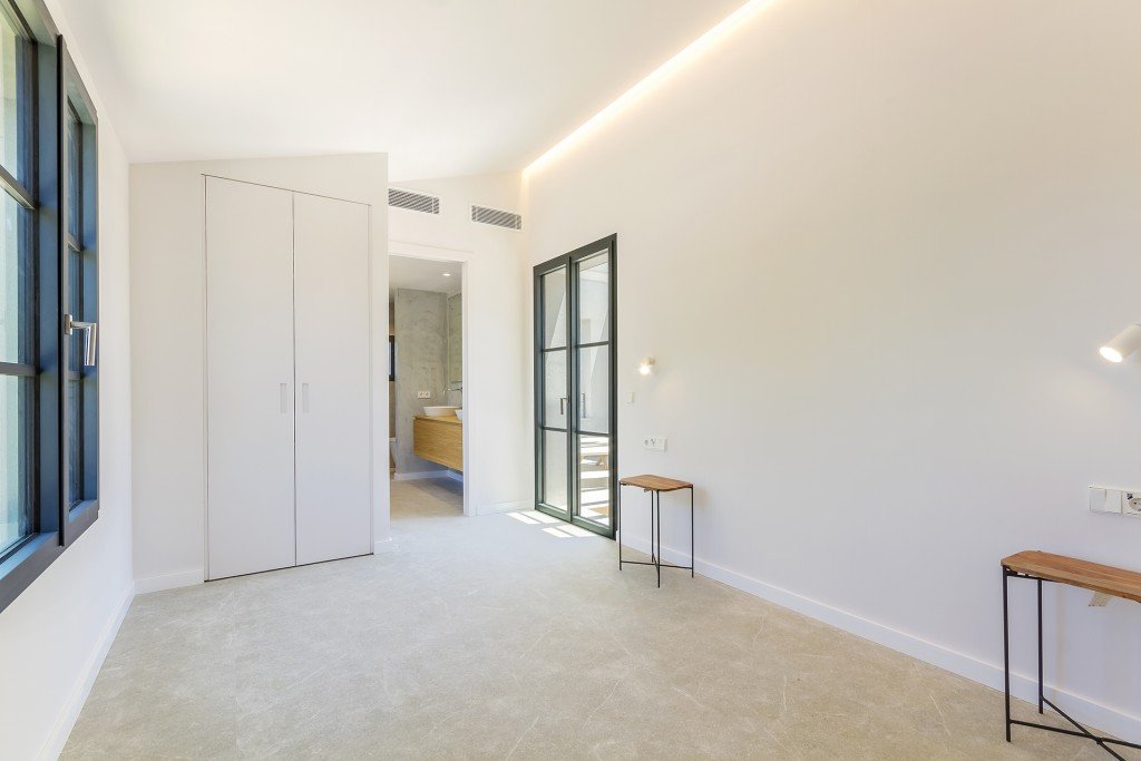 Die Villa ist durchgehend hell und luftig, mit hohen Decken und klarem, zeitgenössischem Design, das den Raum wunderschön akzentuiert. Im Erdgeschoss des Hauses befindet sich eine große Eingangshalle und auf der rechten Seite der Schlafbereich. Es gibt drei Doppelschlafzimmer, jedes mit eigenem Bad, darunter eine Master-Suite mit Ankleideraum, ein Bad mit Badewanne und ein Atrium, das noch mehr natürliches Licht hereinlässt,