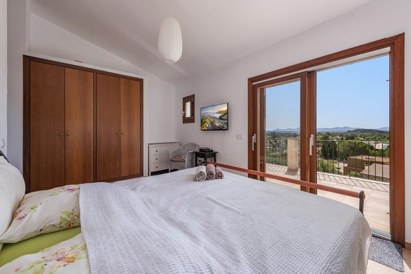 Im Erdgeschoss befinden sich zwei Doppelschlafzimmer und ein Badezimmer. Eines der Schlafzimmer verfügt über eine Galerieebene, ideal als Schlafplatz für Kinder. Im Obergeschoss bietet die Villa zwei weitere Schlafzimmer mit en-suite Badezimmern sowie Zugang zu einem großen Balkon mit traumhaftem Ausblick.