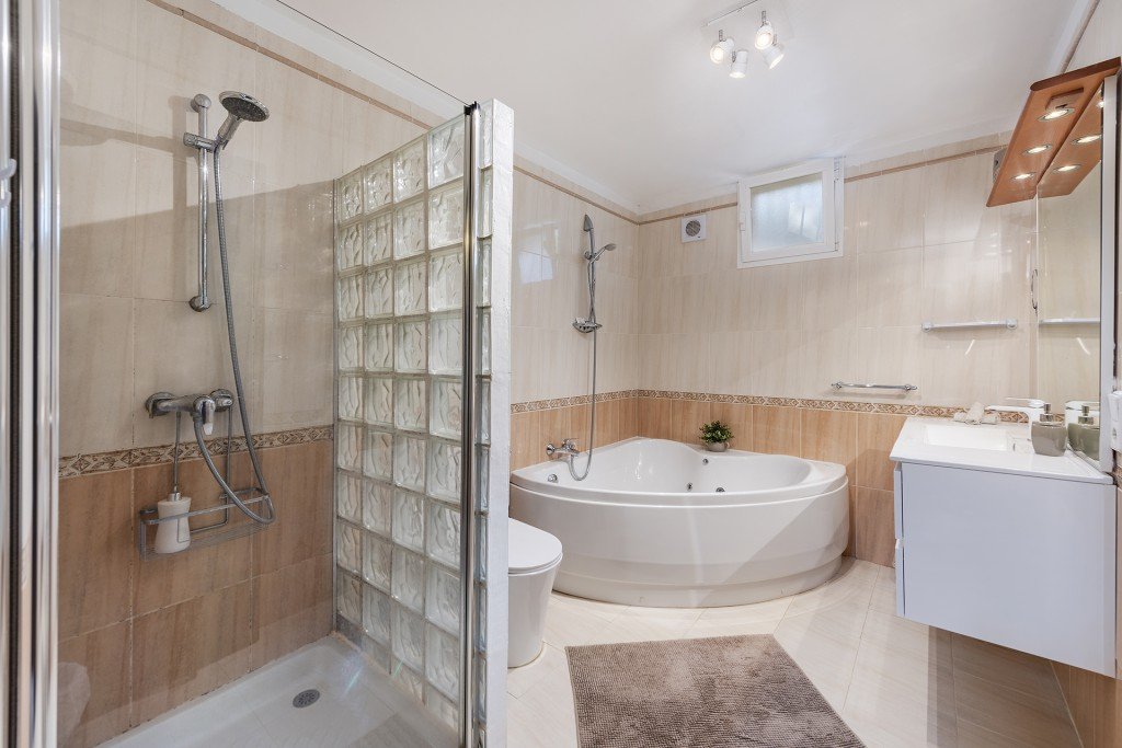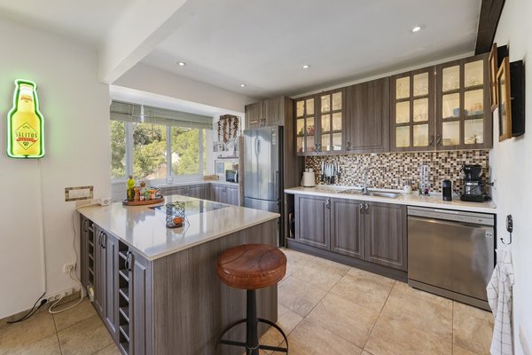 Sie können die Villa über zwei Eingänge betretten. Im Obergeschoss befindet sich der Hauptwohnbereich mit offenem Konzept und moderner Küche mit einer großen Arbeitsinsel und integrierten Geräten. Vom Essbereich aus können Sie durch die großen Fenster einen atemberaubenden Meerblick genießen. Der Wohnbereich umfasst einen schönen offenen Kamin und ein Panoramafenster mit Blick auf den Poolbereich. In der unteren Etage befinden sich die drei Schlafzimmer, drei Badezimmer und der Zugang zur unteren Terrasse.