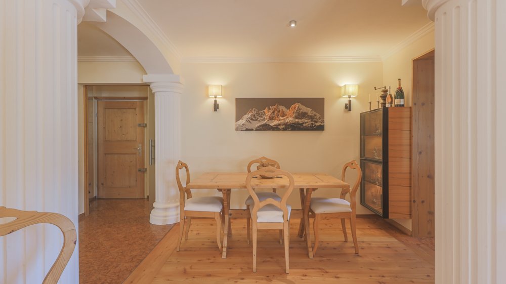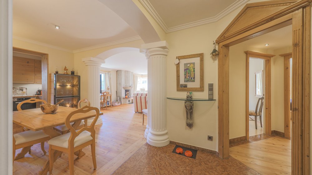 Die in der Wohnung befindlichen Säulen, kombiniert mit rustikalen Holzelementen, spiegeln eine gelungene Symbiose zwischen Eleganz und Tradition wider.