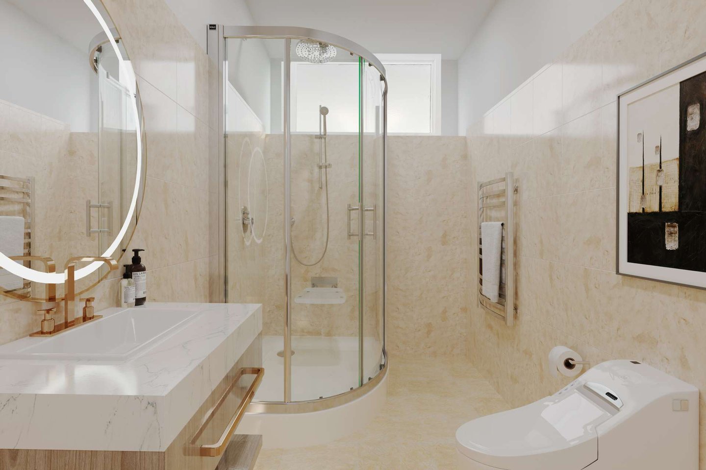 Das Badezimmer bedarf noch einer Instandsetzung. Es empfiehlt sich, die Armaturen und die Dusche zu erneuern, um den Wohnkomfort zu steigern.