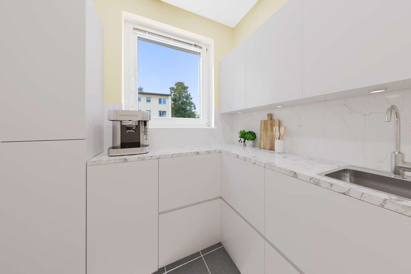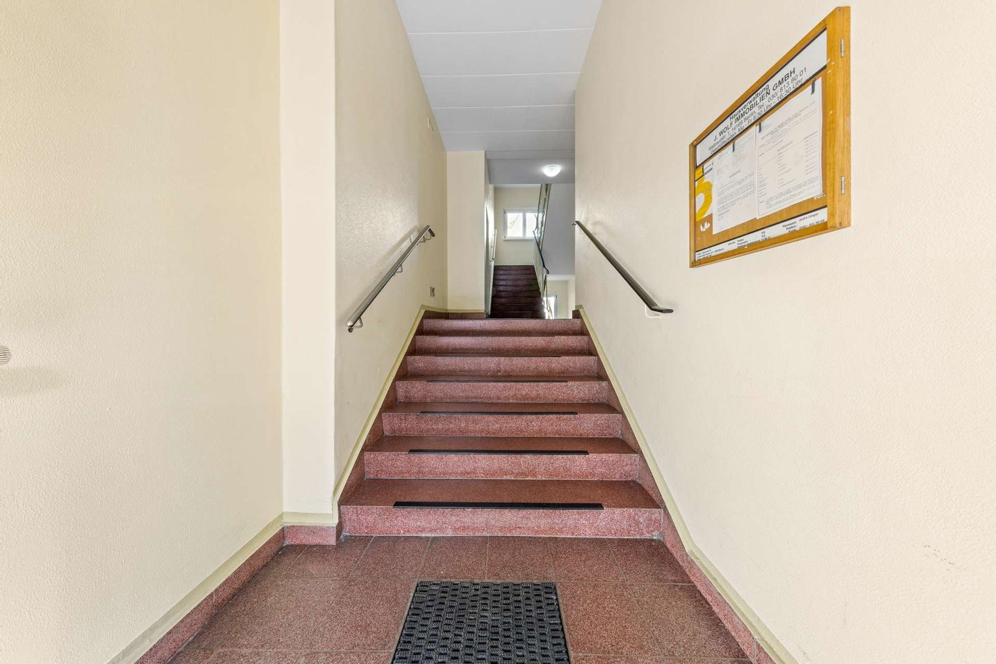 Diese gepflegte Einraumwohnung im ersten Stock eines Apartmentkomplexes aus den 1960er Jahren wurde kürzlich renoviert. Der Wohnbereich erstrahlt in neuem Glanz: Die Wände wurden tapeziert, und ein neuer Laminatboden in Parkettoptik sorgt für eine angenehme Atmosphäre. Die Einbauküche bietet viel Stauraum, jedoch ohne Herd, sodass eine Neuanschaffung empfohlen wird. Im Eingangsbereich sowie in der Küche sorgen zusätzliche Einbauschränke für weiteren Stauraum. Ein großzügiges Kellerabteil gehört ebenfalls zur Wohnung.