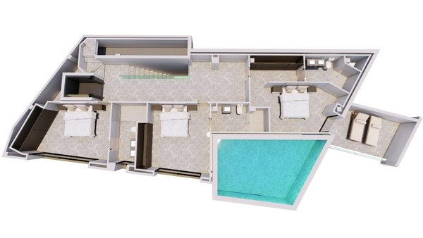 Auf der unteren Ebene befinden sich das Hauptschlafzimmer mit Ankleideraum, Bad en suite und eigener Terrasse sowie zwei weitere Schlafzimmer, jeweils mit Bad en suite.