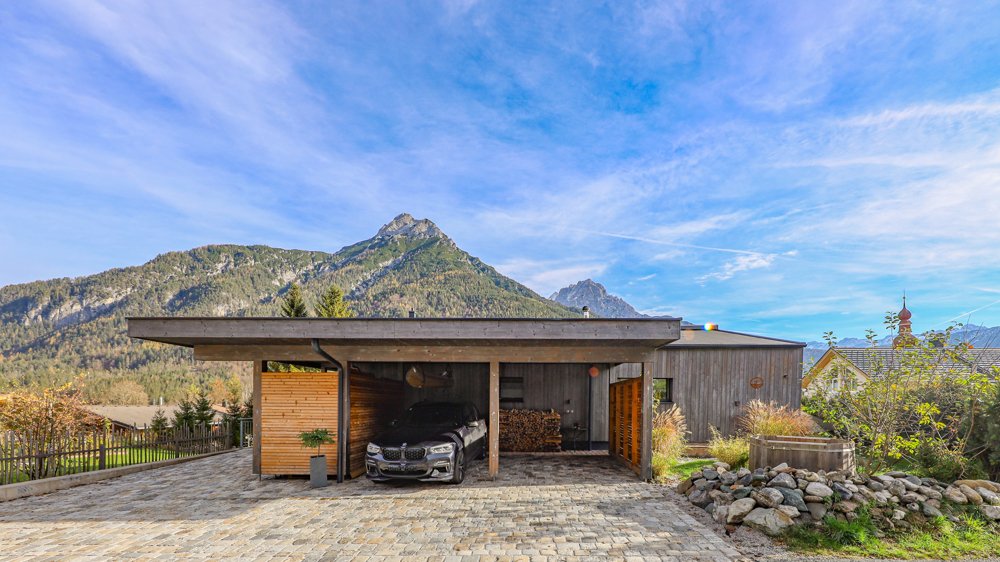Zwei große Carportplätze sowie 4 weitere PKW-Stellplätze wurden auf exklusivem historischen Wiener Pflaster aus dem 18. Jahrhundert angelegt. Ein Abstellraum für Fahrräder, Ski etc. sowie ein Raum für die Entsorgungsbehälter, fügen sich harmonisch in den Außenbereich ein.