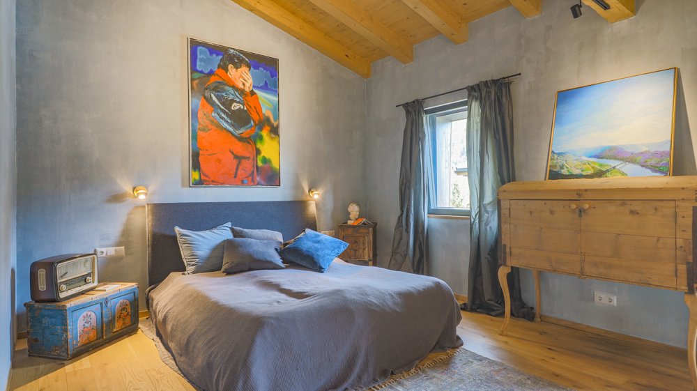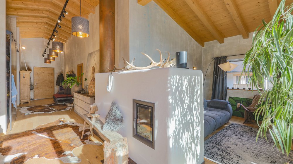Der sehr große Wohnbereich trennt sich unter dem offenen Dachstuhl durch einen zentral situierten Kachelofen in den Essbereich mit der Kochinsel und in die Lounge.