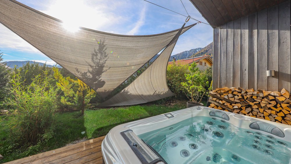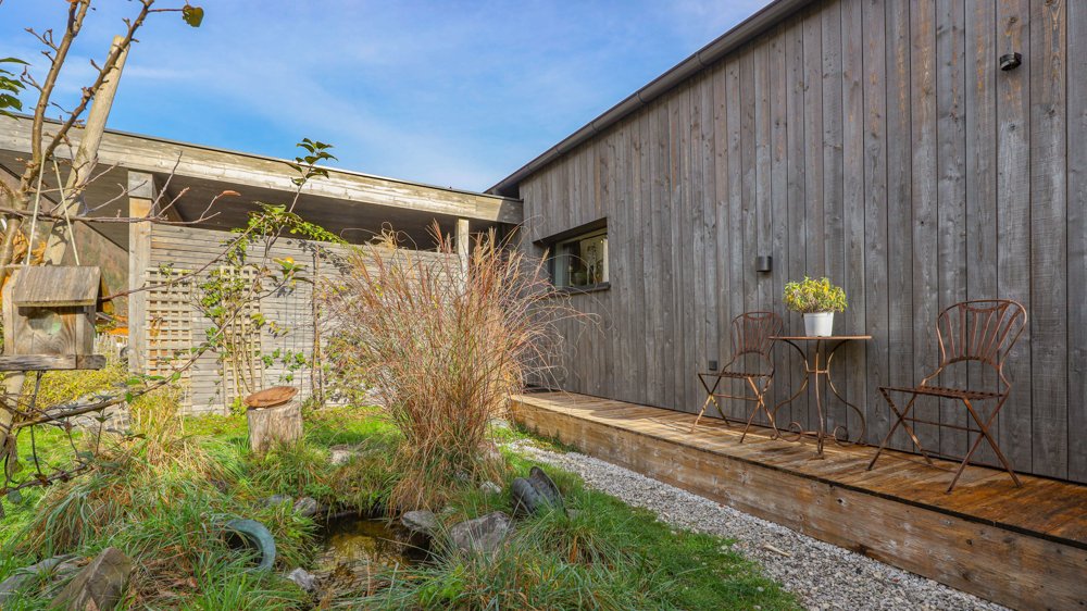 Man betritt das Haus über die Diele mit freiem Blick in den Wohn-/Essbereich und auf den aus jedem Raum in dieser Ebene sichtbaren offenen gehackten Dachstuhl. Eine fast vollständig verglaste und grossflächig zu öffnende Südfront gibt den Blick auf die grosszügig angelegte Süd Terrasse frei, die mit Loungebereich/Sitzgruppe, Feuerschale und ganzjährig beheiztem Whirlpool zum Verweilen einlädt.
