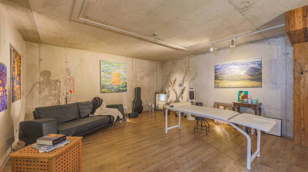 Das Untergeschoss ist als großer Praxisraum/Studio eingerichtet, an den sich ein weiterer, derzeit nicht ausgebauter Raum anschliesst, in dessen hinterem Bereich die Haustechnik untergebracht ist.