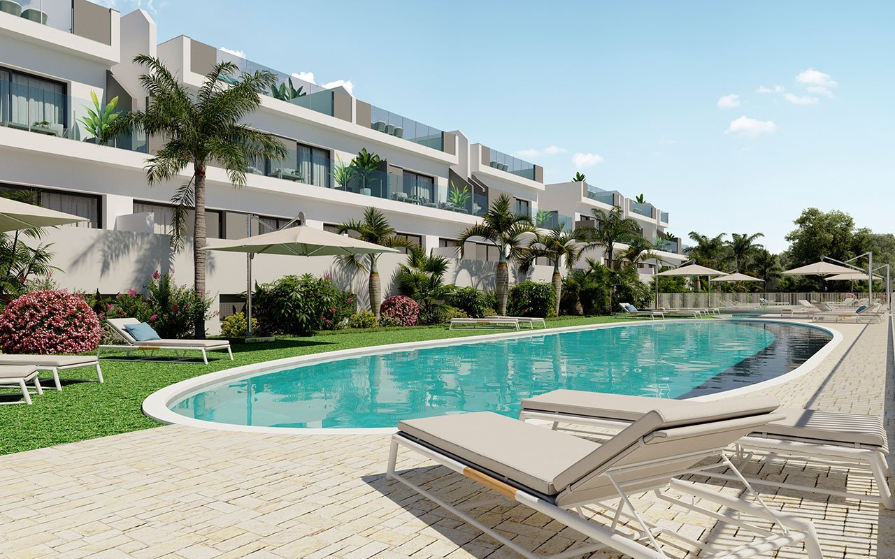 Die Wohneinheiten verfügen unter anderem über Aluminiumfenster mit Doppelverglasung und elektrischen Rollläden, Sicherheitstüren, komplett möblierte Einbauküchen mit Elektrogeräten, Einbauschränke in den Schlafzimmern, aerothermische Wärmepumpen für die Heißwasserversorgung, Möbel und Duschtrennwände in den Bädern und Kfz-Stellplätze in der Tiefgarage. Und selbstverständlich ist auch eine großzügige Grünzone mit Gemeinschaftspools vorhanden und die Doppelhaushälften verfügen über einen Privatpool.