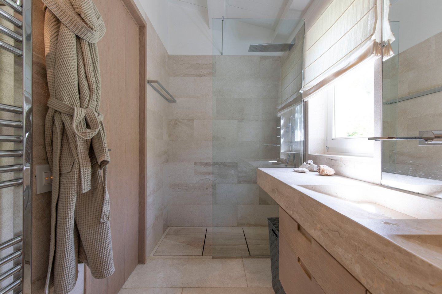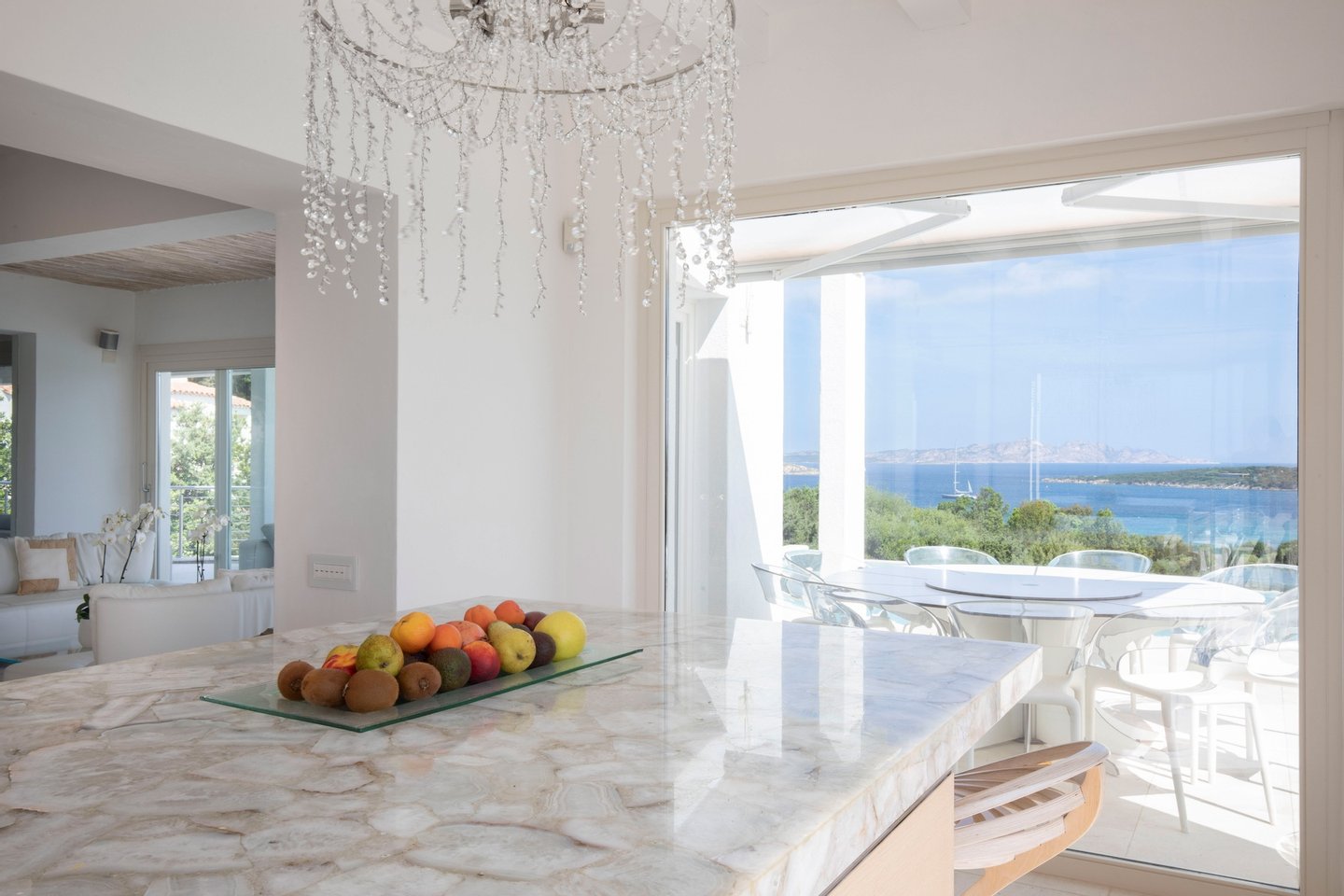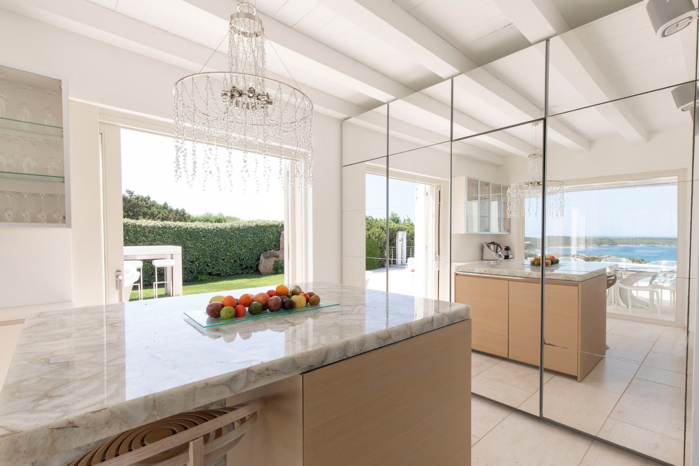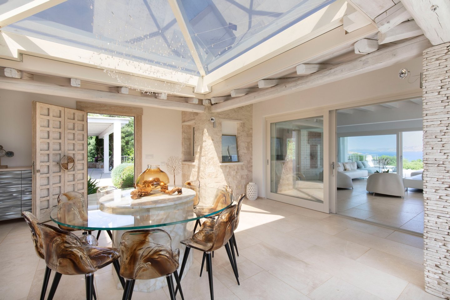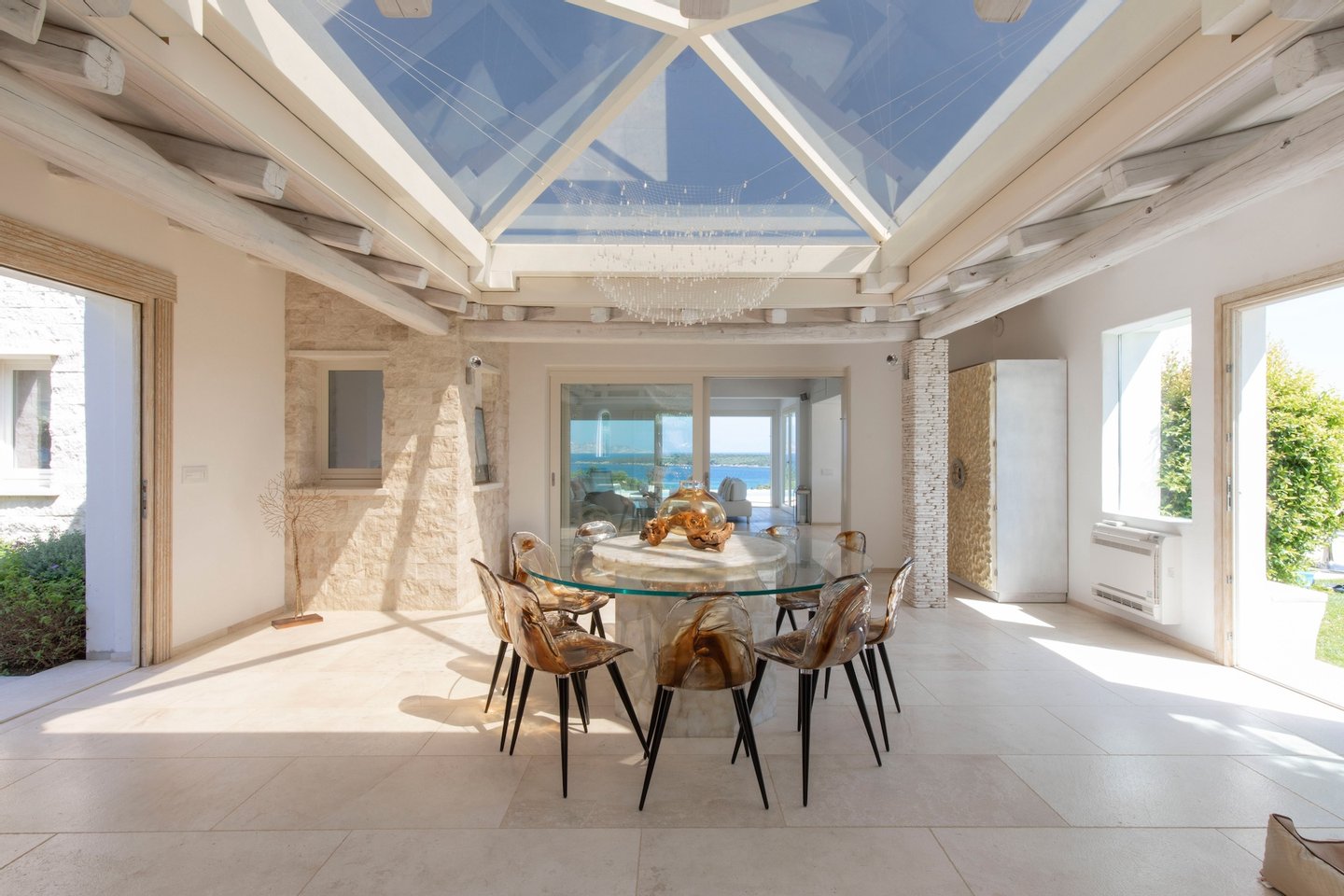 The home accommodates guests in 6 bedrooms each with their private bathrooms and an additional guest bathroom near the living area. From the wonderfully designed living room and glass roof dining area with modern open kitchen, you can access the terrace with scenic pool and outside dining area. All these entertainment spaces as well as the outside dining area and equipped barbecue have wonderful panoramic views of the nearby sea.