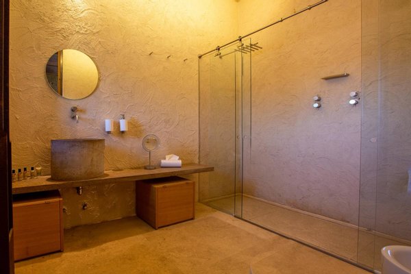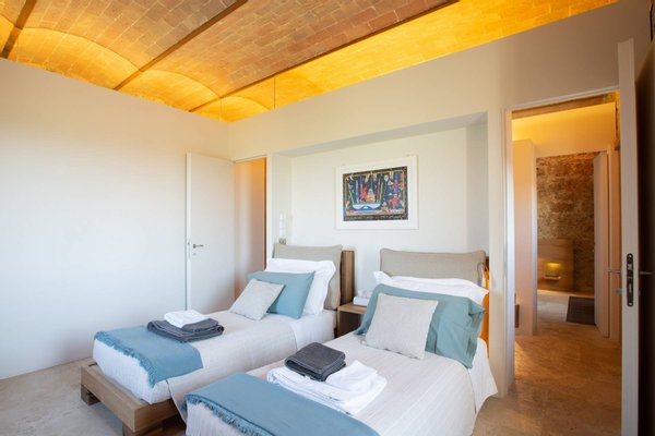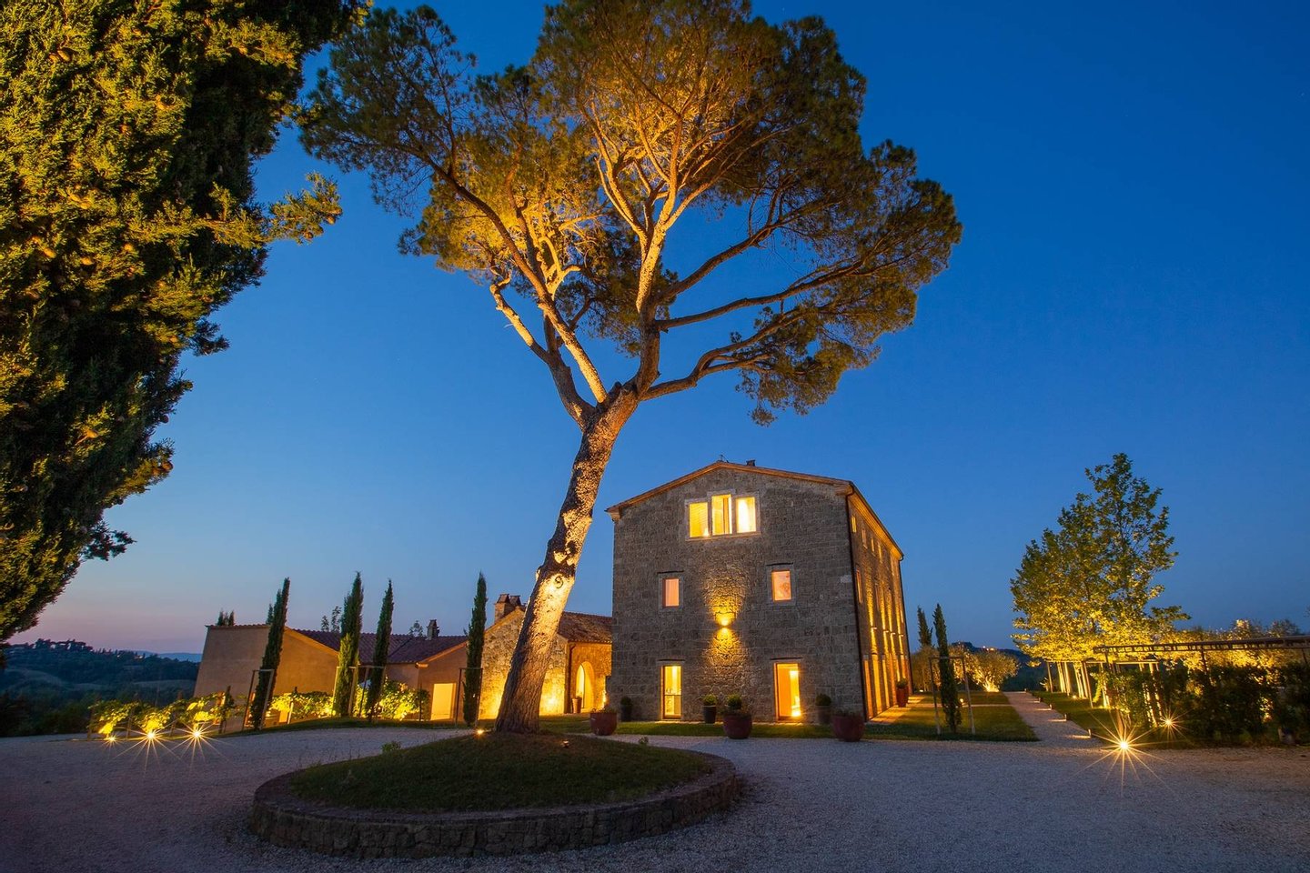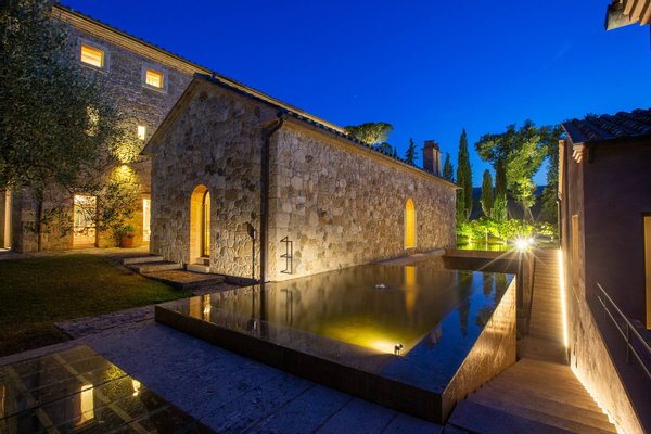 Podere Etrusco is structured around an ancient farmhouse made of travertine blocks, the style of the entire complex. The farmhouse has a favorable south-facing position and offers an incredible view of the surrounding landscape. To the north of the farmhouse, there is a multifunctional room and apartments for guests, perfectly integrated with the complex, via paths and stone steps running around two large decorative pools. The courtyard below is partly dedicated to a fitness area.