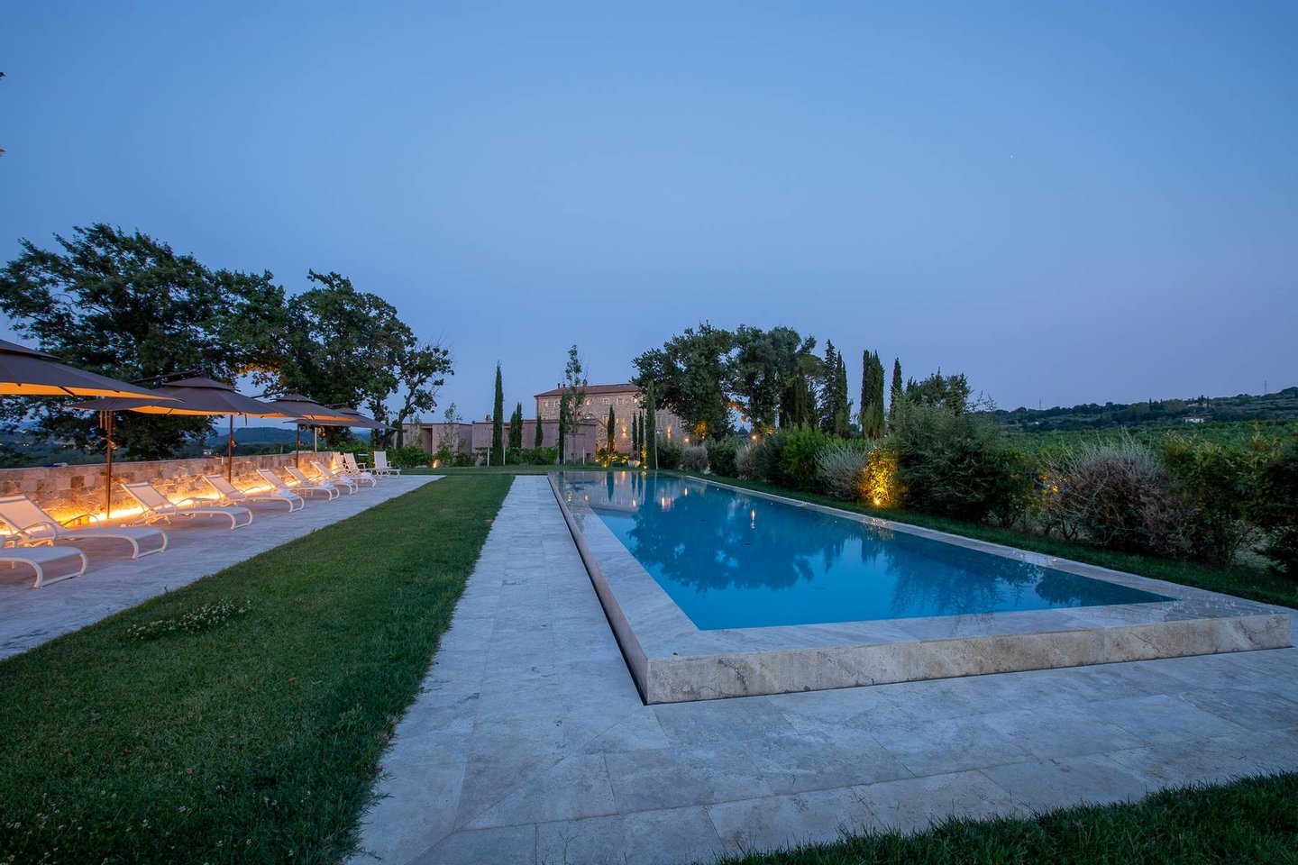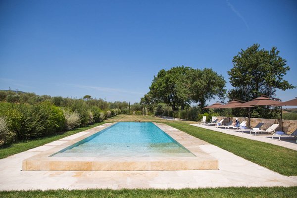 Podere Etrusco is the ideal place for a pleasant and relaxing stay immersed in nature. You can take a stroll in the vineyards, relax under the beautiful olive trees or follow the paths through the countryside, leading to Sarteano. For those who like sport, the property organizes different activities and offers fitness equipment, bicycles, a bowling green, a tennis court and a swimming pool. The lovely infinity pool, also made of travertine, is surrounded by lush green countryside situated between the vineyard and the olive grove.