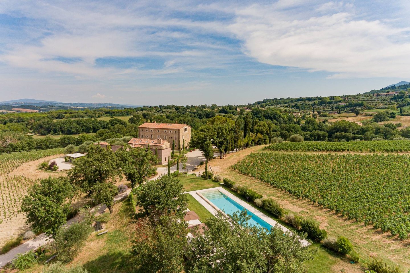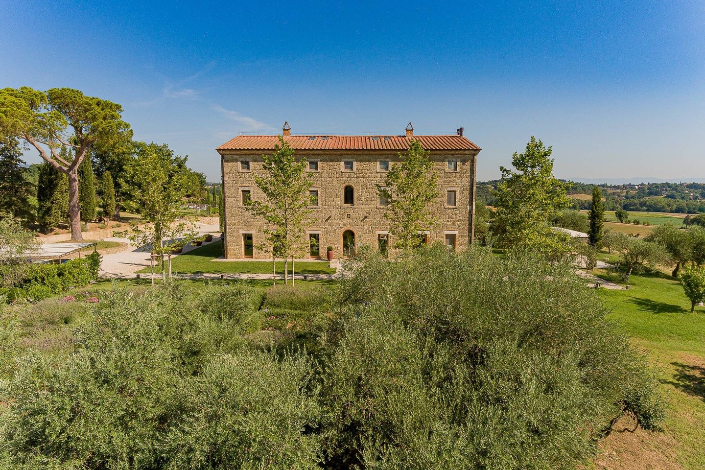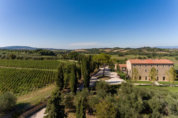Podere Etrusco is structured around an ancient farmhouse made of travertine blocks, the style of the entire complex. The farmhouse has a favorable south-facing position and offers an incredible view of the surrounding landscape. To the north of the