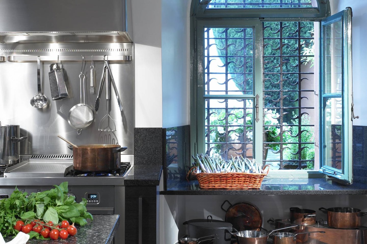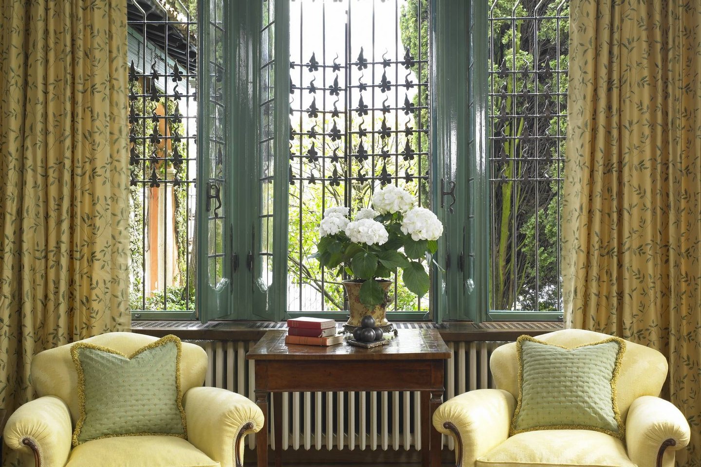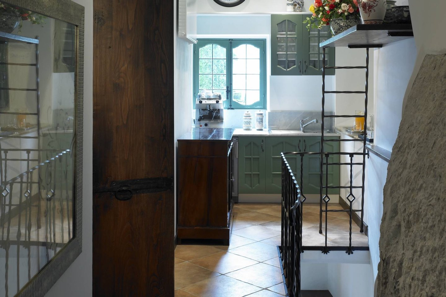 The estate consists of three houses, all offering first class modern facilities complemented by the finest Italian antique furniture, and artwork from all over Europe. The main villa has two elegant floors offering a combination of both living areas and sleeping quarters. Within the main house, guests are greeted by a great foyer featuring Senese marble floors and elegant wrought iron railing, a formal living room with wooden floors, a marble fireplace and ample seating. The living room connects to a covered terrace where guests can leisurely dine al fresco. The main villa also features an elegant dining area with ample seating and working fireplaces, which is connected to a pantry and professional kitchen.