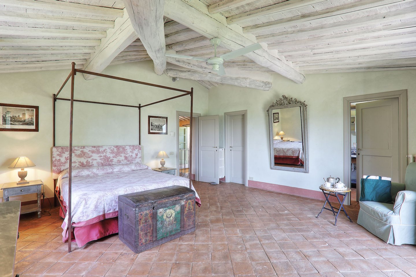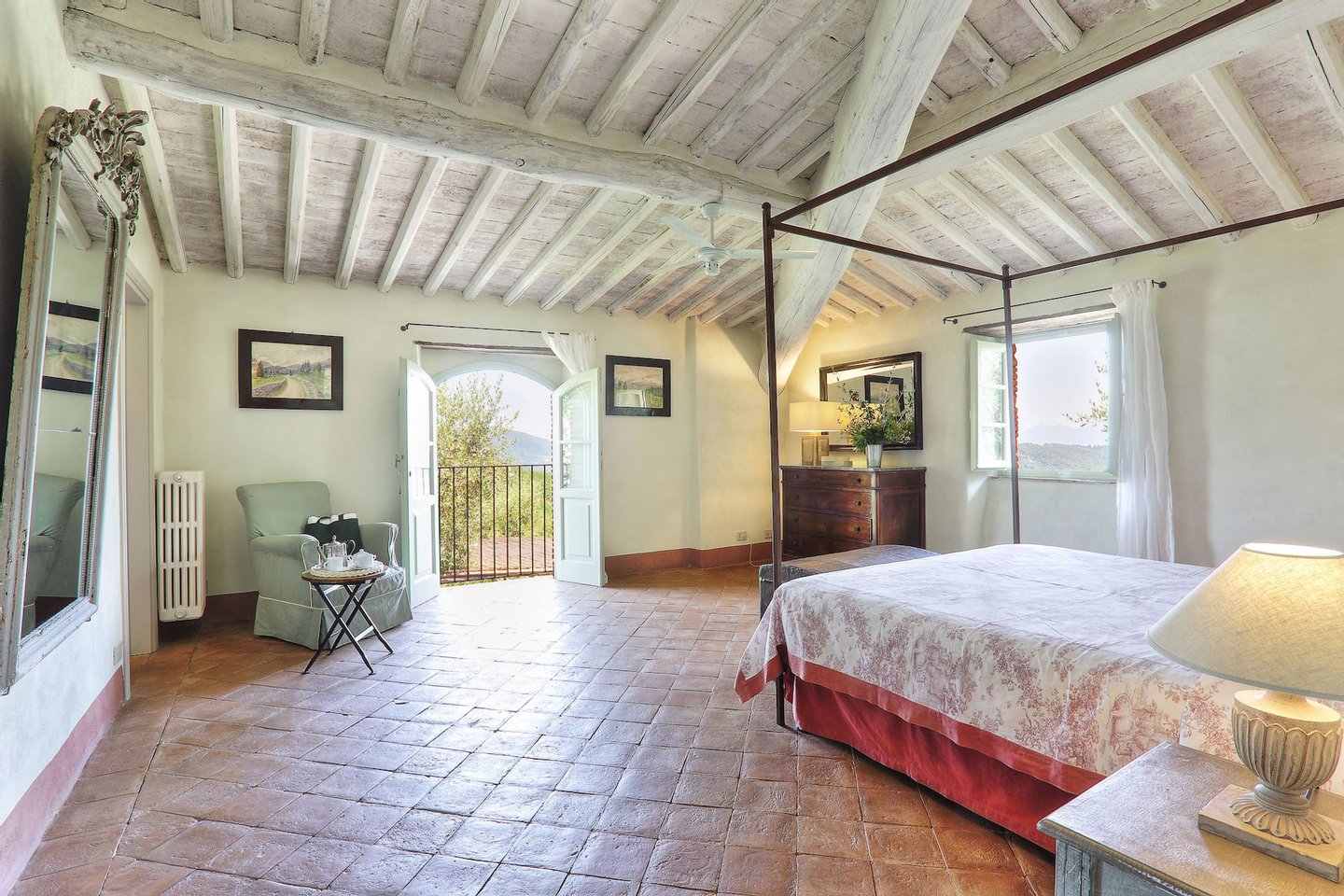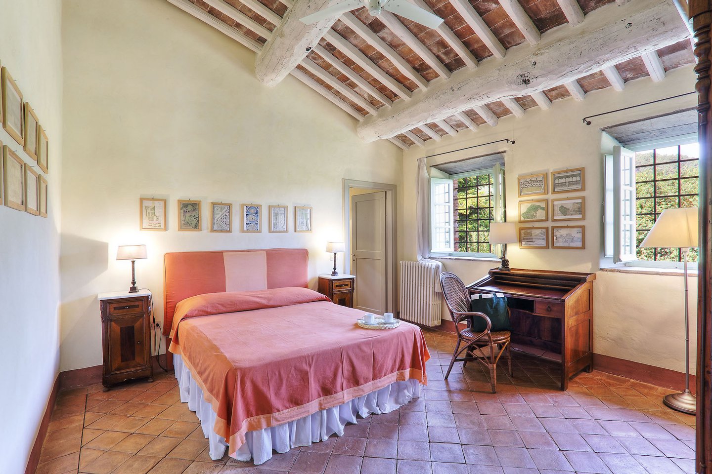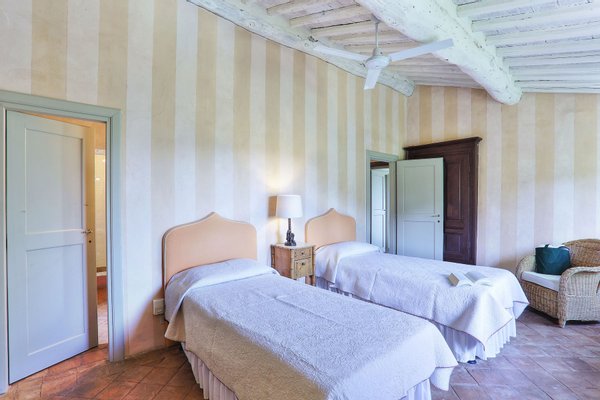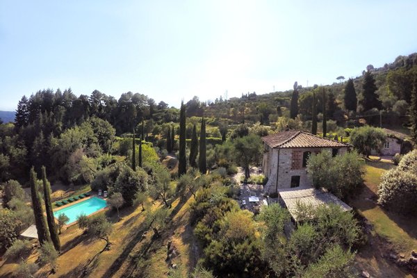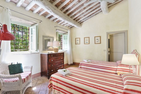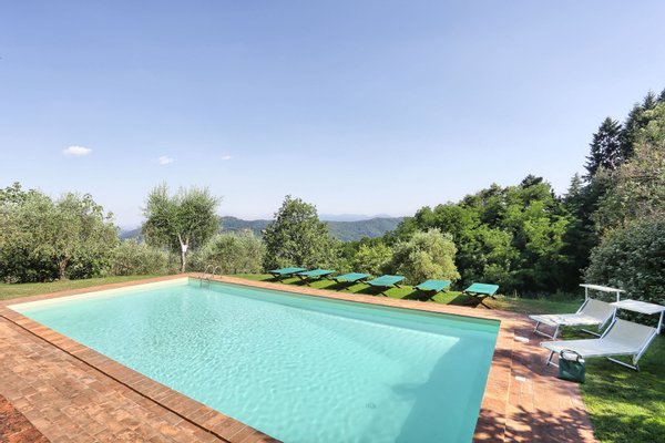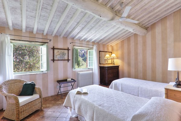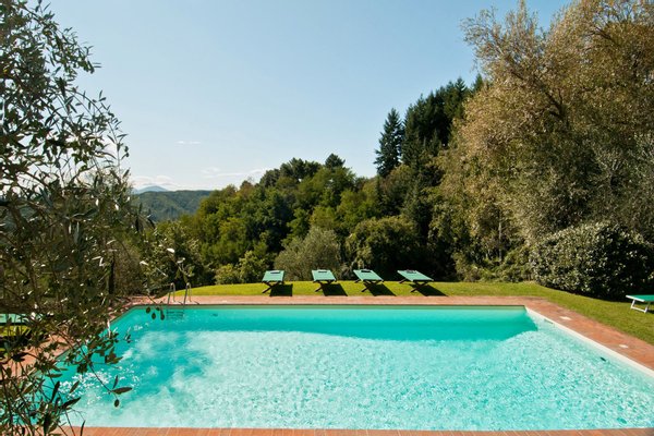 This elegant estate is situated near the seaside, with the Apuane and Apennine mountains to the north. It is a short drive to beaches and to magnificent cites like the walled city of Lucca, Pisa with its famous Tower, and the Renaissance Florence. The estate itself offers a wonderful reprieve with its beautiful grounds and pool. The very well groomed garden and terraces offer guests many lovely areas to sit outside and enjoy the views of the countryside. The impressive swimming pool has a salt water filter system that avoids the use of chlorine. Particular care was placed in the construction of this estate, using only traditional materials for this type of structure. The interiors have been tastefully furnished in a country yet elegant style. The house is equipped with all modern amenities, for instance central heating, Wi-Fi, and satellite television. The location of the house, its efficient insulation, and the presence of ceiling fans in every bedroom ensure that the temperature remains comfortable even during the hottest summer nights.