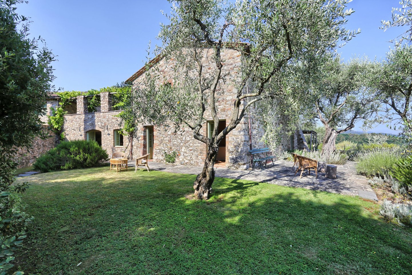 Villa Gladiolo is located in an exceptionally panoramic position among olive groves, in the hills between Lucca and the Versilia coast. The villa was meticulously restored from what were formerly an olive mill and a barn, now connected by a large