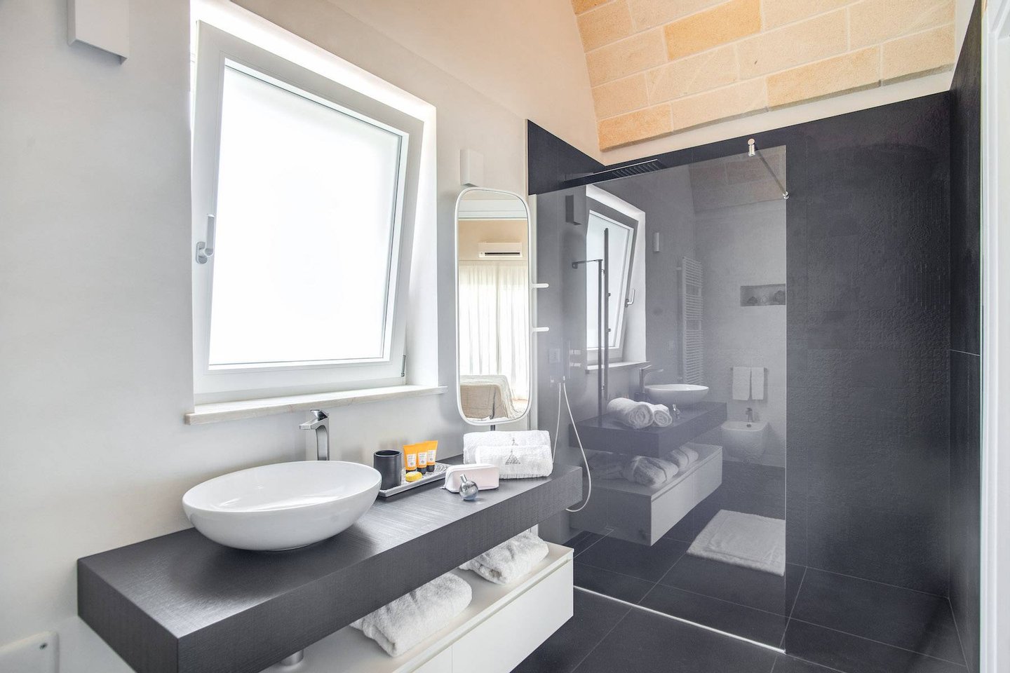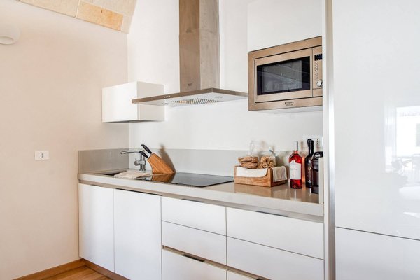 Inside the farm there are 2 bedrooms with en suite bathrooms, a guest bathroom, a large living room with a fully equipped kitchen. The interiors are modern in style, with great design furniture, and offer all comforts (plasma TV with satellite connection, wi-fi, individually adjustable air conditioning and heating, microwave, oven, dishwasher, refrigerator, tea and coffee maker) : exclusive environments that recreate a family atmosphere, with an extra touch of elegance and constant attention to detail.