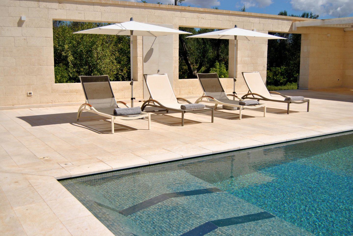 The waterfall pool (5x8m) is entirely decorated with mosaics, heated, and with hydromassage. The pool has a shower. Bathrobes and towels are provided. In the pool area there is a seating area, with a large sofa, cushions, tables and umbrellas, where you can relax in the sun and enjoy a cocktail. On one side of the pool there is a bar entirely covered in Carrara marble and black Marquinia marble. The bar is equipped with a dishwasher, an ice machine and a fridge.