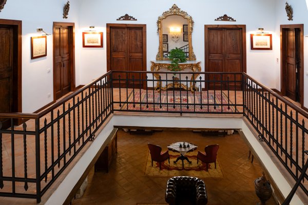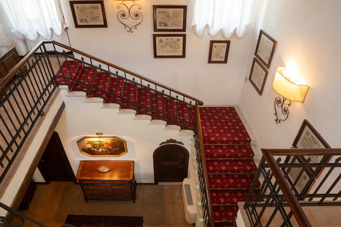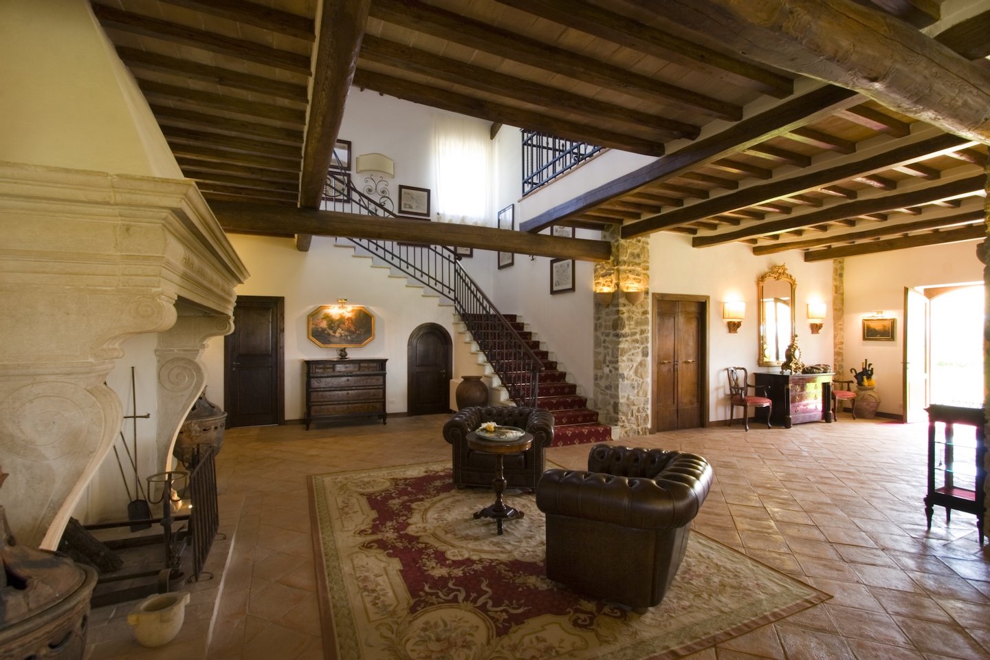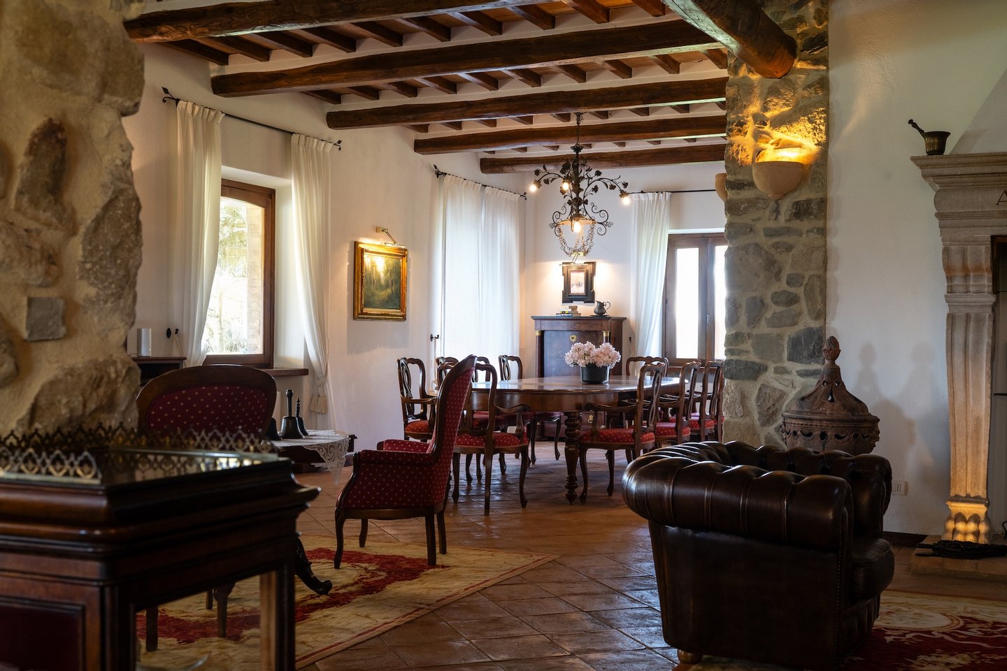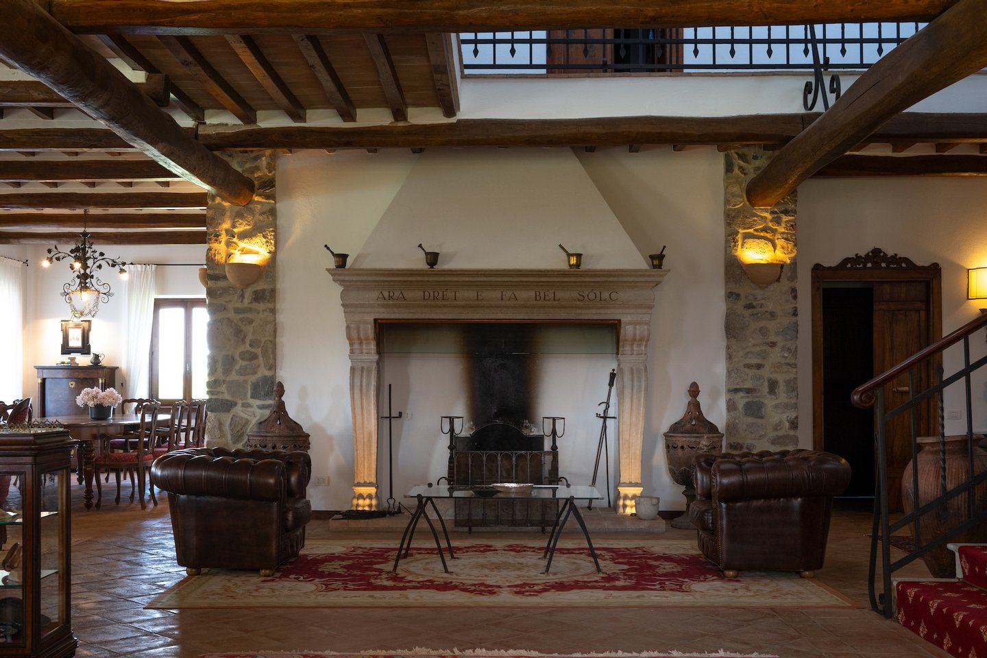 The villa features a gorgeous marble fireplace and open staircase - that make the space warm, refined, and open. Tufted leather chairs alongside the hearth provide a cosy spot to repose in the middle of the house. The living and dining rooms both have beamed ceilings, beautiful plush carpets laid over tile floor, regal red dining chairs, antique loveseats, and modern sofas: the perfect amalgamation of modern, traditional, and luxury.
