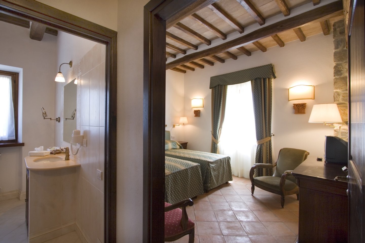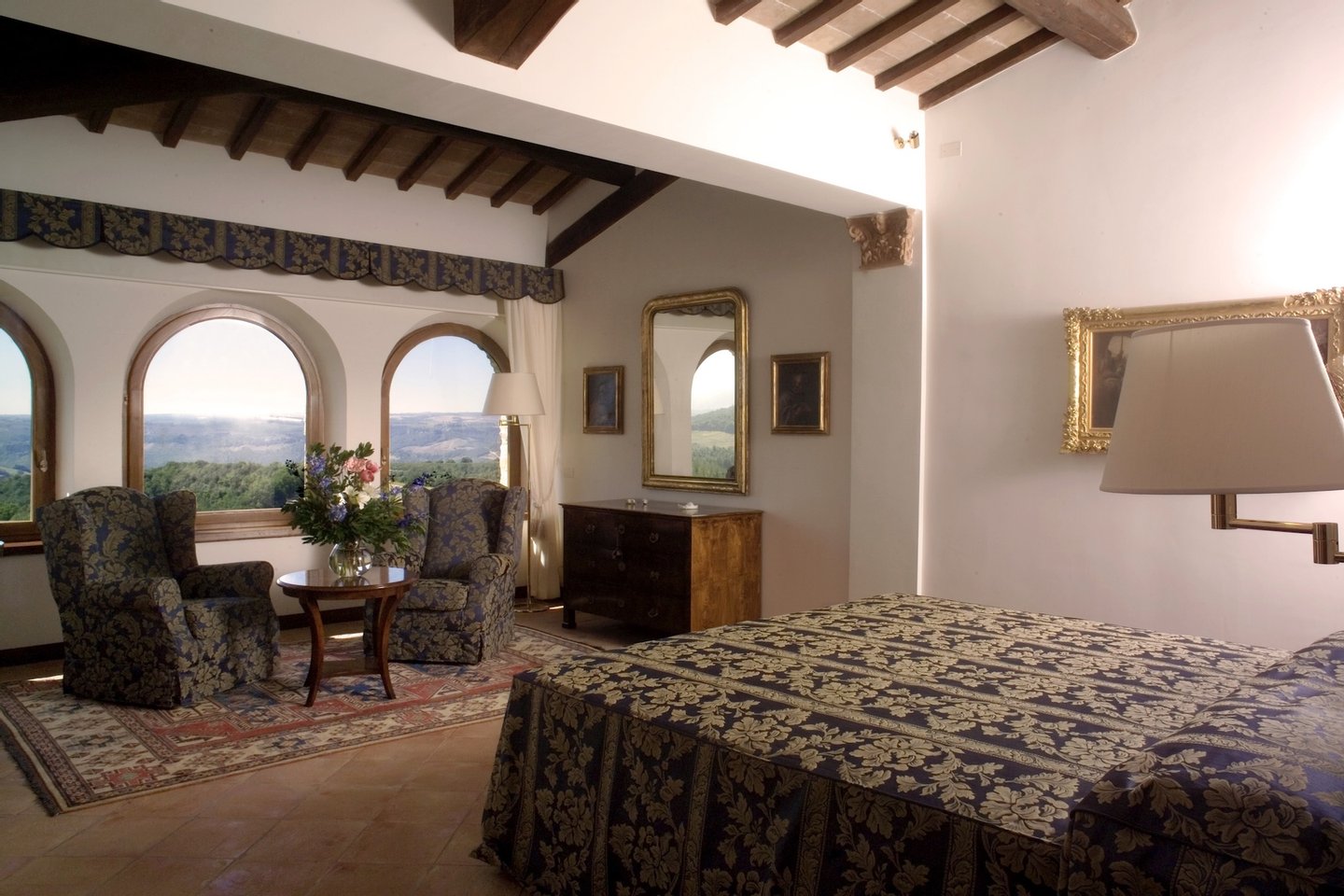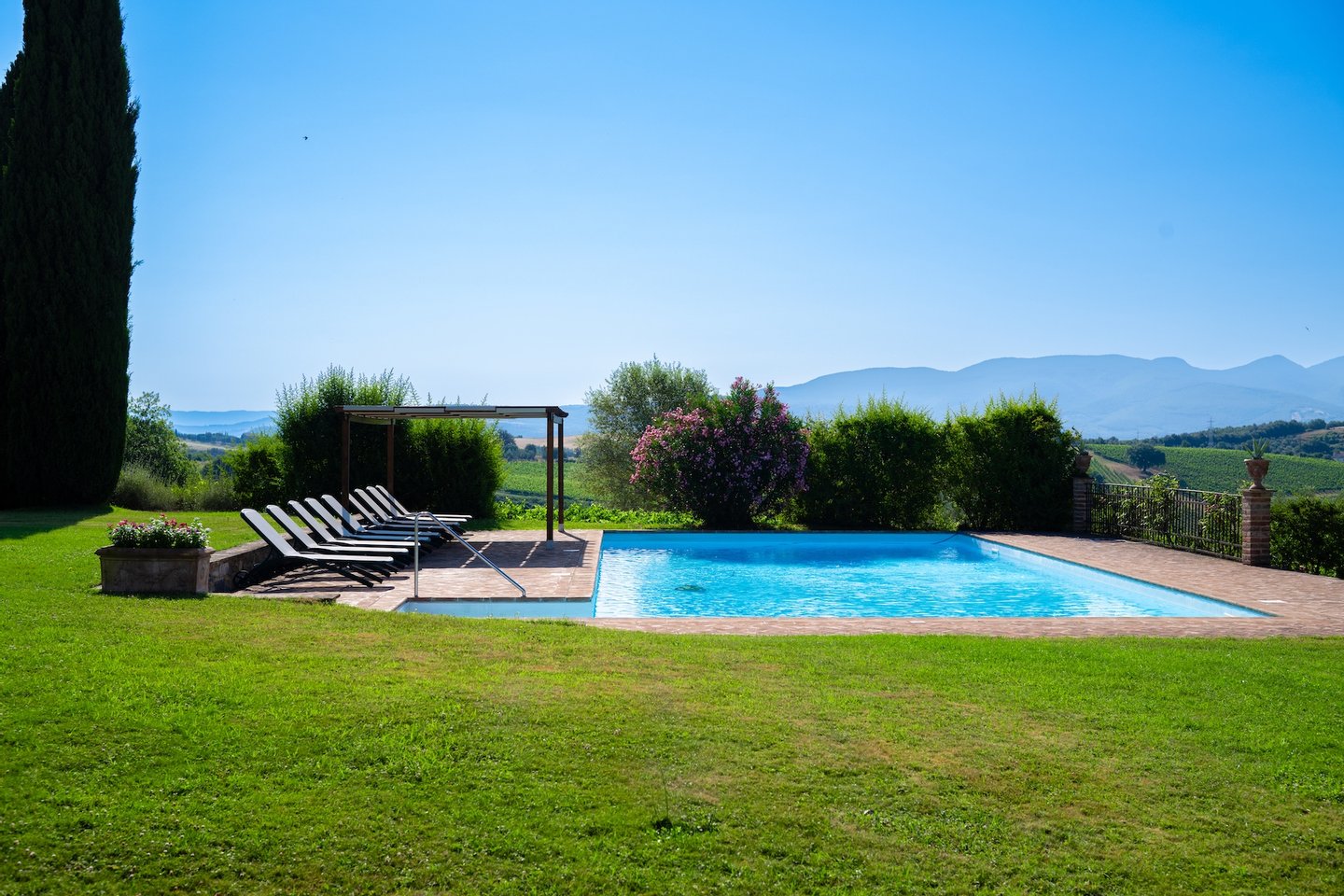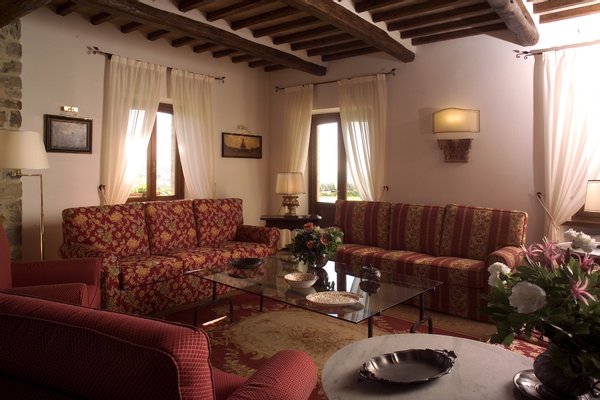 The villa, surrounded by green lawns and vineyards, is perched on the hills overlooking Lake Corbara. The villa is conveniently located just an hour and a half from both Rome, with its Roman ruins, and Florence, with its Renaissance masterpieces, both with major international airports. The villa is a mere 15-minute drive to Orvieto, a 30-minute drive to Todi, a 45-minute drive to Perugia, and a 50-minute drive to Assisi. For guests wishing to repose in the grounds of this gated estate, they can relax beside the gorgeous pool or enjoy a glass of local wine in the loggia.