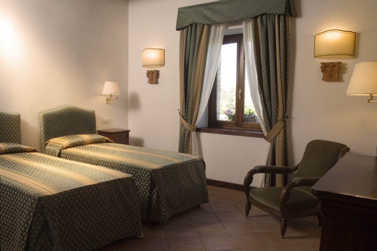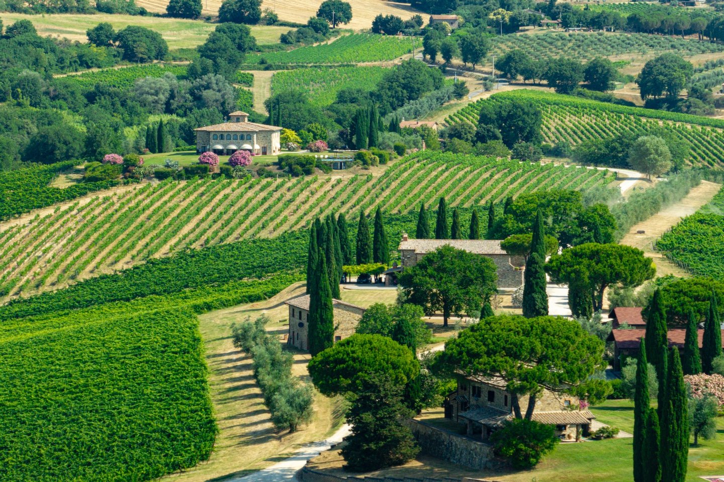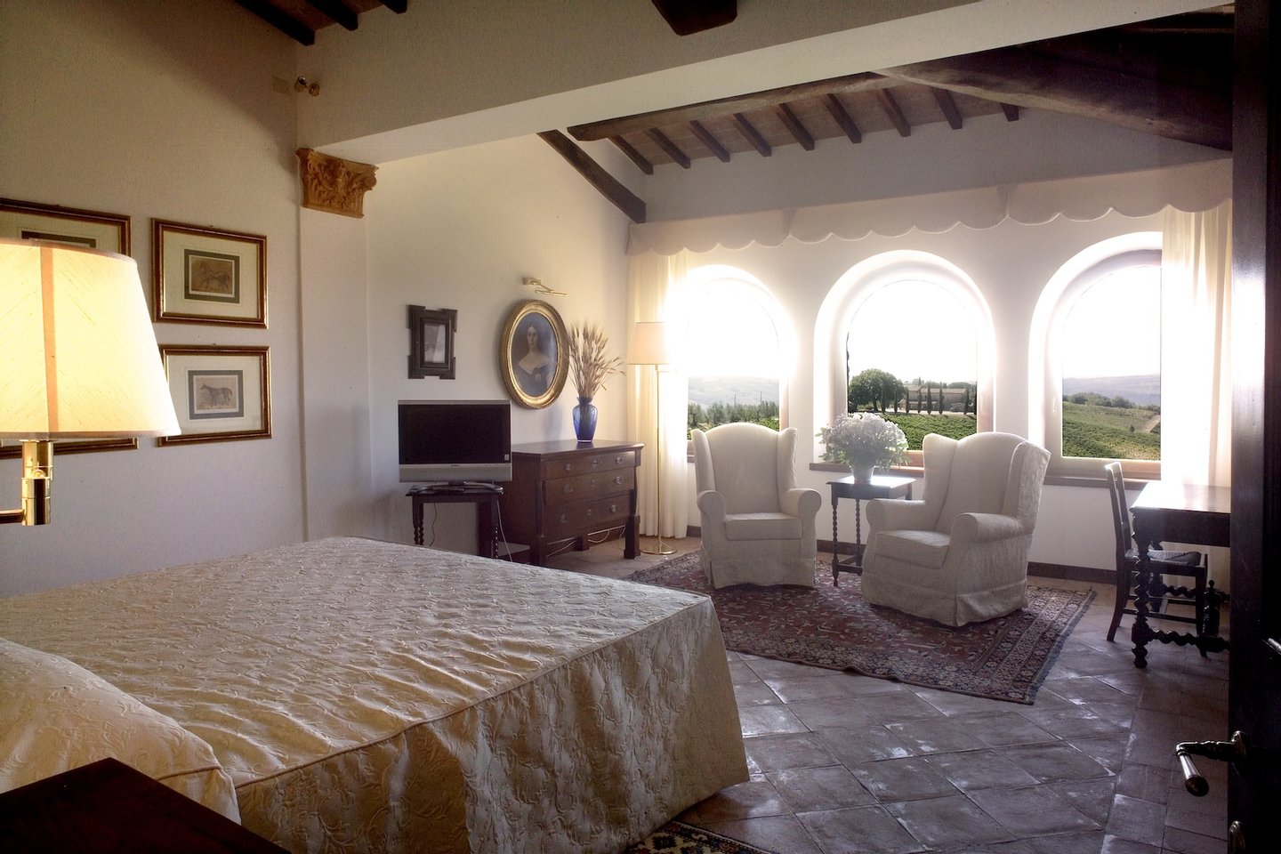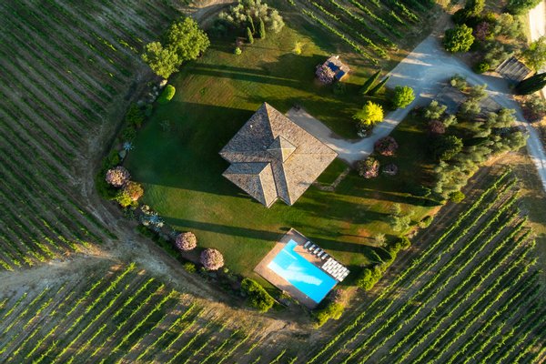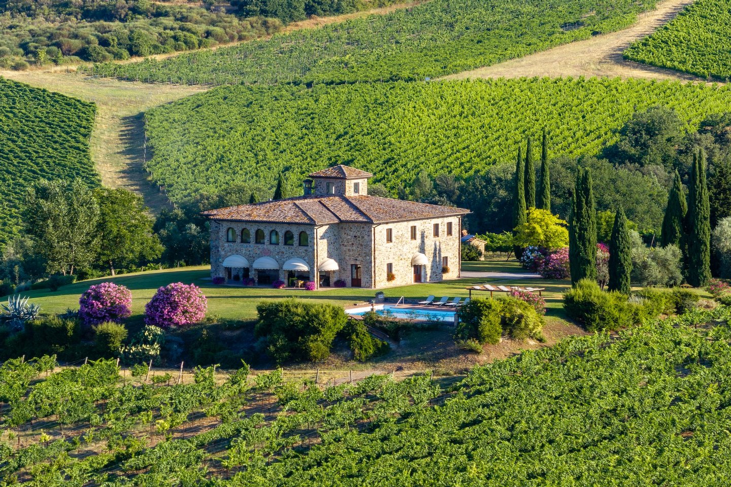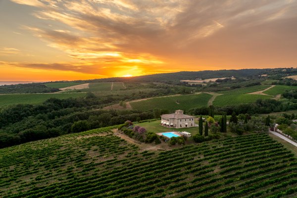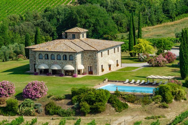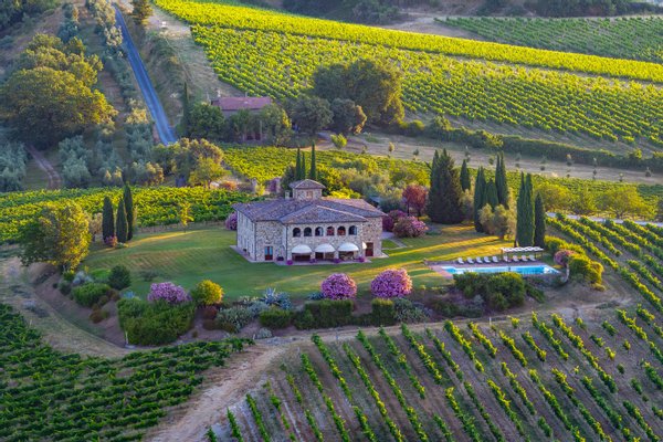 The villa, surrounded by green lawns and vineyards, is perched on the hills overlooking